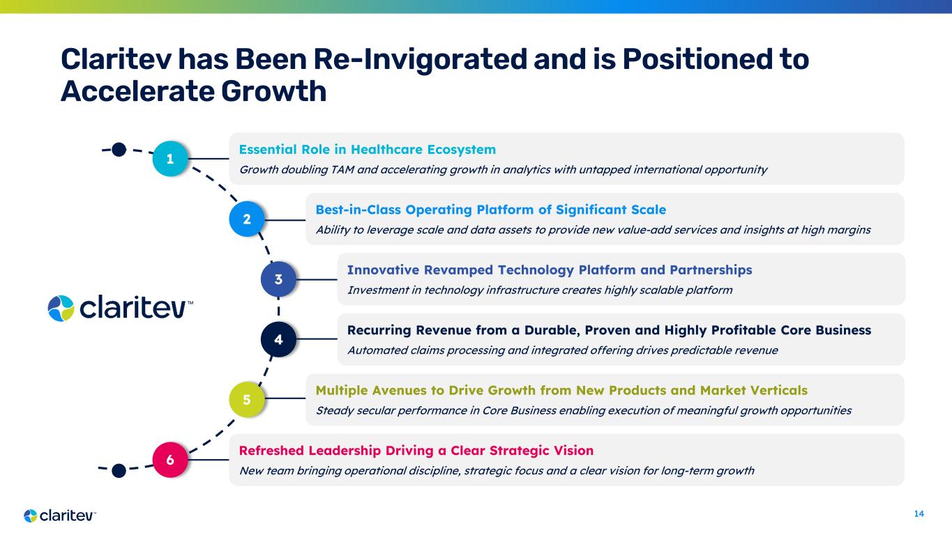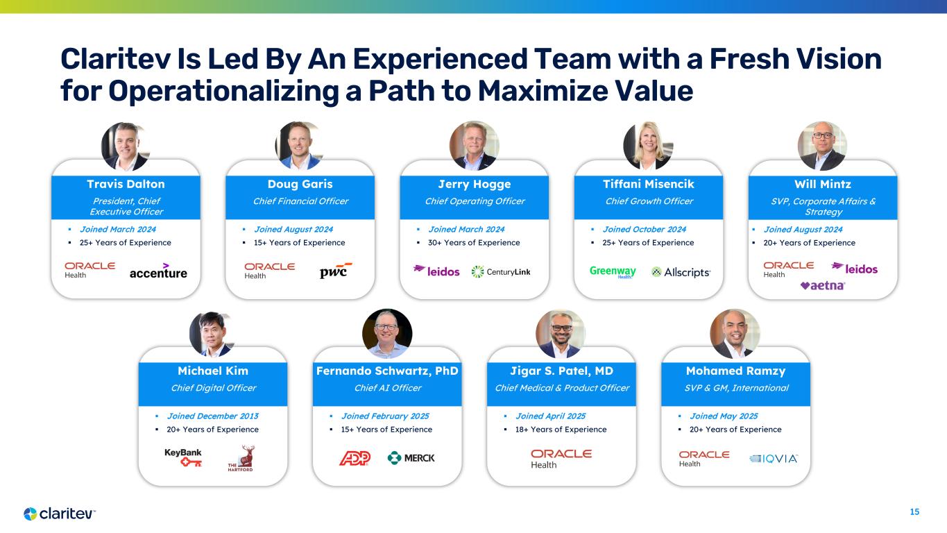 14 Claritev has Been Re-Invigorated and is Positioned to Accelerate Growth 6 2 3 1 4 5 Recurring Revenue from a Durable, Proven and Highly Profitable Core Business Automated claims processing and integrated offering drives predictable revenue Multiple Avenues to Drive Growth from New Products and Market Verticals Steady secular performance in Core Business enabling execution of meaningful growth opportunities Best-in-Class Operating Platform of Significant Scale Ability to leverage scale and data assets to provide new value-add services and insights at high margins Innovative Revamped Technology Platform and Partnerships Investment in technology infrastructure creates highly scalable platform Refreshed Leadership Driving a Clear Strategic Vision New team bringing operational discipline, strategic focus and a clear vision for long-term growth Essential Role in Healthcare Ecosystem Growth doubling TAM and accelerating growth in analytics with untapped international opportunity