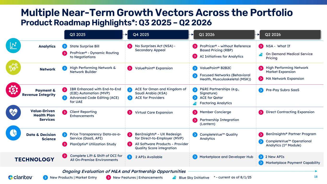 17 Build and manage custom healthcare provider networks with access to 1.4M credentialed providers Data-driven reimbursement solutions for out-of-network claims & support for NSA compliance Identify, correct and prevent improper billing to optimize accuracy and reduce waste and abuse in the healthcare system that lowers cost of care Deliver actionable, digestible insights to improve plan and network design and lower healthcare costs by identifying and better serving high risk patients that improve outcomes Integrated health plan solutions including reference- based pricing and exclusive network access that enable employers to reduce medical cost and increase employee satisfaction Network-Based Solutions Key Solutions • Complementary networks • Primary networks • Government networks • Property & casualty and other Analytics-Based Solutions Key Solutions • Data iSight & other out- of-network analytics • Surprise bill services Payment & Revenue Integrity Solutions Key Solutions • Clinical negotiation • Clinical review / advanced code editing • Other pre-pay and post- pay payment & revenue integrity solutions Data & Decision Science Solutions Key Solutions • BenInsights • Payor solutions (e.g. PlanOptix) • Provider solutions (e.g. CompleteVue) • Risk, analytics, insights & other Value-Driven Health Plan Services Key Solutions • Value-Driven Health Plan services • Balance bill protection Claritev Offerings Fully integrated platform providing exceptional products and services to customers