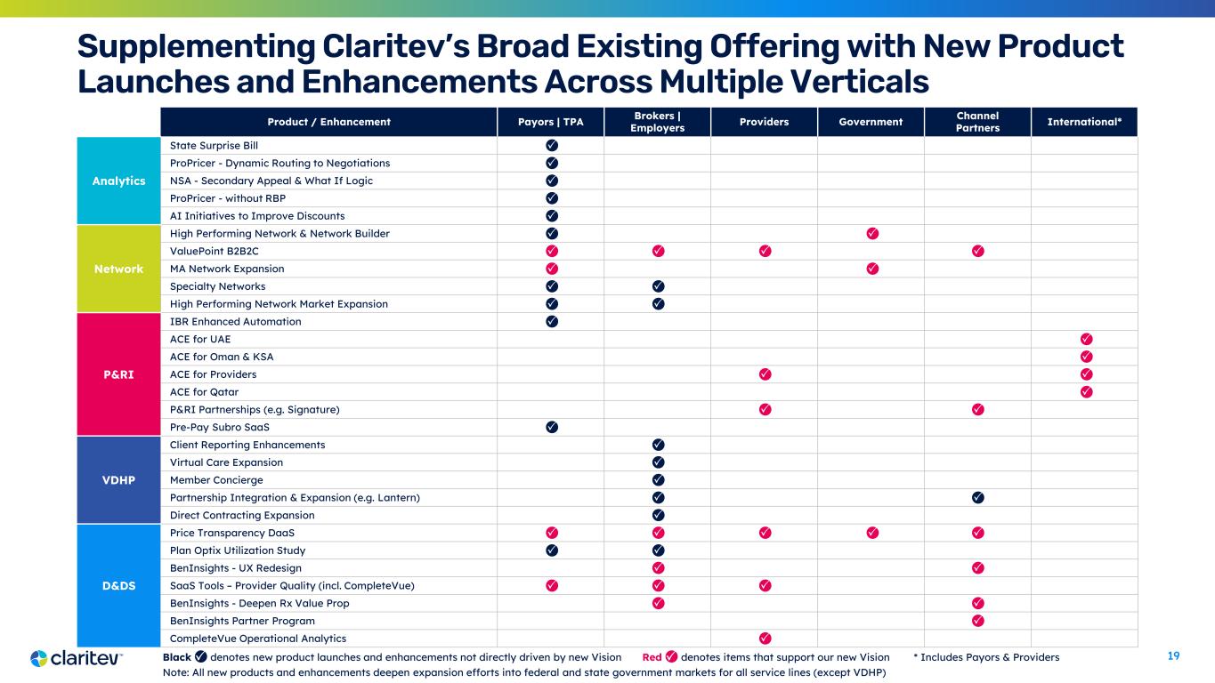 18 Multiple Near-Term Growth Vectors Across the Portfolio Product Roadmap Highlights*: Q3 2025 – Q2 2026 Analytics Network Payment & Revenue Integrity Data & Decision Science State Surprise Bill ValuePoint® Expansion Q3 2025 Q4 2025 Q1 2026 Q2 2026 IBR Enhanced with End-to-End (E2E) Automation (MVP) ACE for Oman and Kingdom of Saudi Arabia (KSA) Price Transparency Data-as-a- Service (DaaS, API) BenInsights® Partner ProgramBenInsights® – UX Redesign for Direct-to-Employer (MVP) No Surprises Act (NSA) - Secondary Appeal ValuePoint® B2B2C Value-Driven Health Plan Services New Products | Market Entry New Features | Enhancements High Performing Network & Network Builder P&RI Partnerships (e.g., Signature) TECHNOLOGY Complete Lift & Shift of OCI for All On-Premise Environments ACE for Providers Marketplace and Developer Hub Virtual Care ExpansionClient Reporting Enhancements Member Concierge ProPricer® – without Reference Based Pricing (RBP) NSA - What If Partnership Integration (Lantern) High Performing Network Market Expansion Factoring Analytics Direct Contracting Expansion Focused Networks (Behavioral Health, Musculoskeletal (MSK)) Pre-Pay Subro SaaS All Software Products – Provider Quality Score integration CompleteVue Quality Analytics CompleteVue Operational Analytics (1st Module)PlanOptix® Utilization Study On Demand Medical Service Pricing Advanced Code Editing (ACE) for UAE ACE for Qatar ProPricer® - Dynamic Routing to Negotiations Blue Sky Initiative 2 APIs Available 2 New APIs Marketplace Payment Capability Ongoing Evaluation of M&A and Partnership Opportunities AI Initiatives for Analytics MA Network Expansion * - current as of 8/1/25