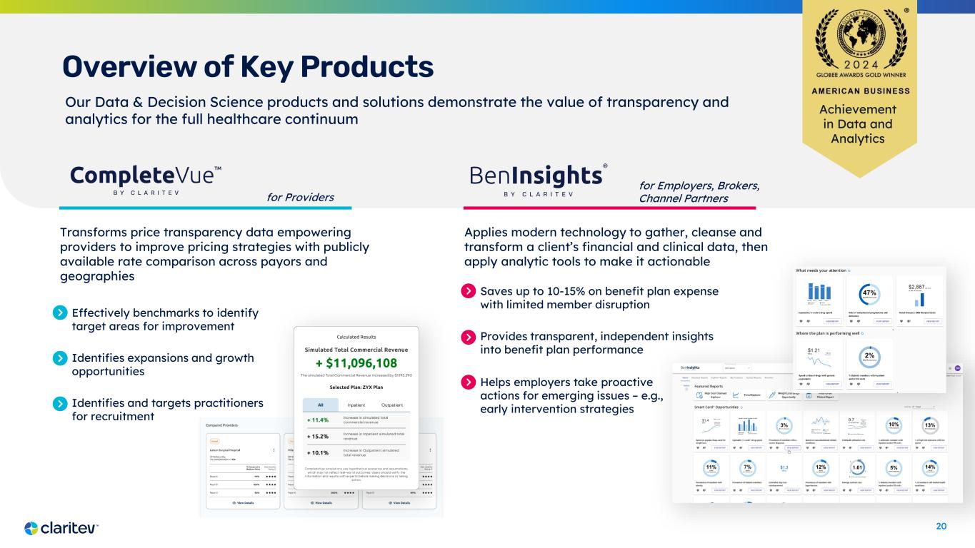 19 Supplementing Claritev’s Broad Existing Offering with New Product Launches and Enhancements Across Multiple Verticals Red denotes items that support our new Vision * Includes Payors & Providers Note: All new products and enhancements deepen expansion efforts into federal and state government markets for all service lines (except VDHP) Product / Enhancement Payors | TPA Brokers | Employers Providers Government Channel Partners International* Analytics State Surprise Bill ProPricer - Dynamic Routing to Negotiations NSA - Secondary Appeal & What If Logic ProPricer - without RBP AI Initiatives to Improve Discounts Network High Performing Network & Network Builder ValuePoint B2B2C MA Network Expansion Specialty Networks High Performing Network Market Expansion P&RI IBR Enhanced Automation ACE for UAE ACE for Oman & KSA ACE for Providers ACE for Qatar P&RI Partnerships (e.g. Signature) Pre-Pay Subro SaaS VDHP Client Reporting Enhancements Virtual Care Expansion Member Concierge Partnership Integration & Expansion (e.g. Lantern) Direct Contracting Expansion D&DS Price Transparency DaaS Plan Optix Utilization Study BenInsights - UX Redesign SaaS Tools – Provider Quality (incl. CompleteVue) BenInsights - Deepen Rx Value Prop BenInsights Partner Program CompleteVue Operational Analytics                                                 Black denotes new product launches and enhancements not directly driven by new Vision