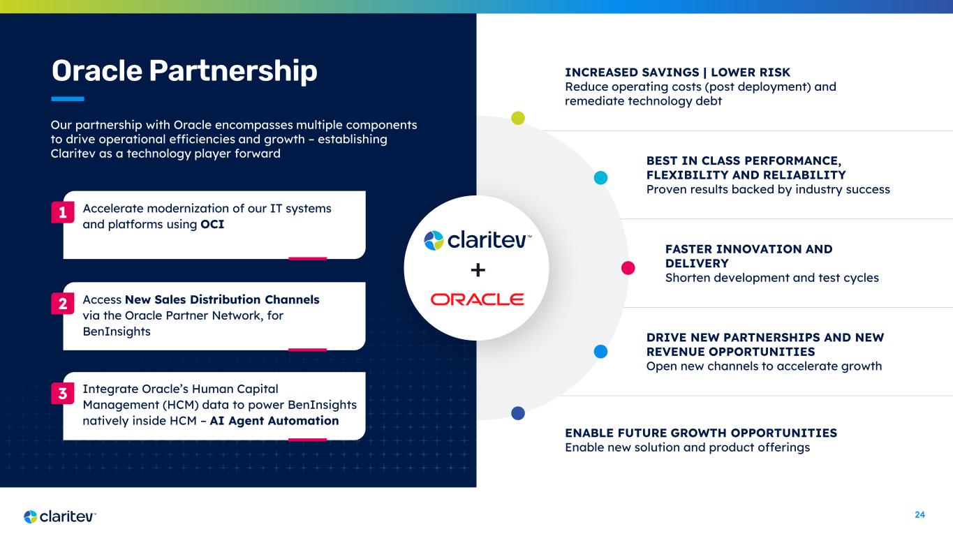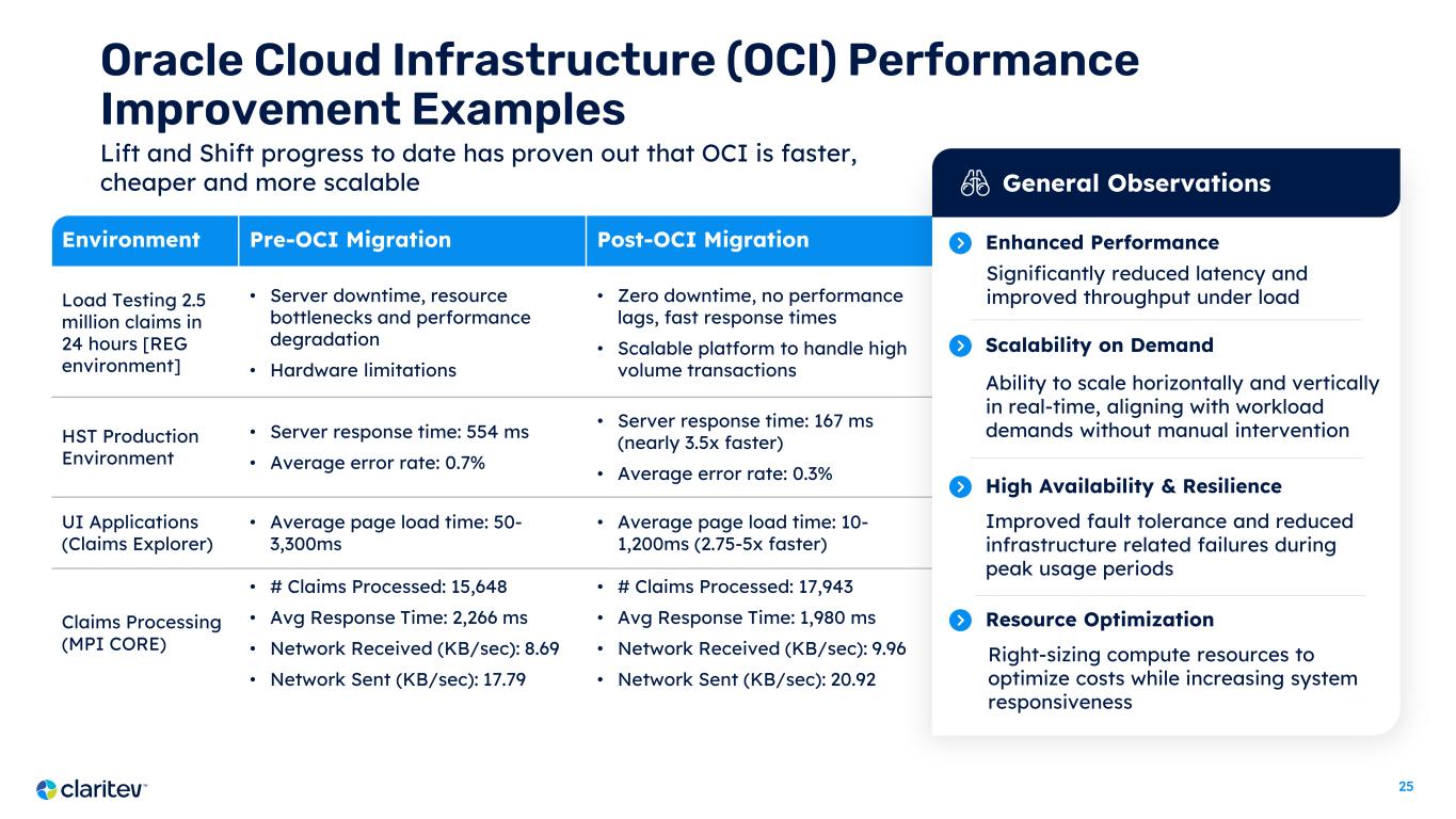 24 INCREASED SAVINGS | LOWER RISK Reduce operating costs (post deployment) and remediate technology debt BEST IN CLASS PERFORMANCE, FLEXIBILITY AND RELIABILITY Proven results backed by industry success FASTER INNOVATION AND DELIVERY Shorten development and test cycles DRIVE NEW PARTNERSHIPS AND NEW REVENUE OPPORTUNITIES Open new channels to accelerate growth ENABLE FUTURE GROWTH OPPORTUNITIES Enable new solution and product offerings Oracle Partnership + Our partnership with Oracle encompasses multiple components to drive operational efficiencies and growth – establishing Claritev as a technology player forward Accelerate modernization of our IT systems and platforms using OCI 1 Access New Sales Distribution Channels via the Oracle Partner Network, for BenInsights 2 Integrate Oracle’s Human Capital Management (HCM) data to power BenInsights natively inside HCM – AI Agent Automation 3