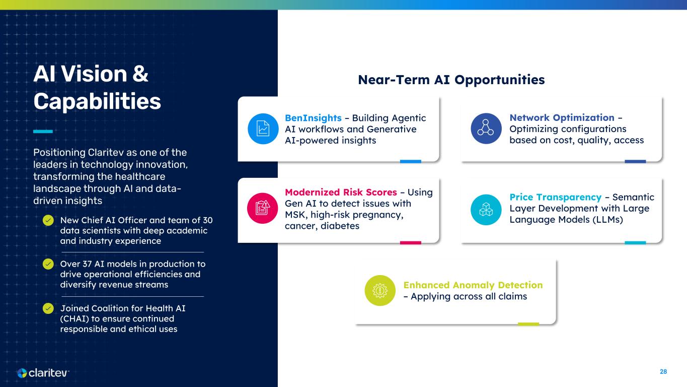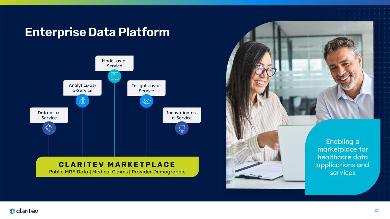 27 Data-as-a- Service C L A R I T E V M A R K E T P L A C E Analytics-as- a-Service Innovation-as- a-Service Insights-as-a- Service Model-as-a- Service Enterprise Data Platform Enabling a marketplace for healthcare data applications and servicesPublic MRF Data | Medical Claims | Provider Demographic
