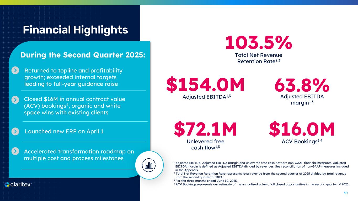 30 Financial Highlights During the Second Quarter 2025: $154.0M $72.1M 103.5% Adjusted EBITDA1,3 63.8% Adjusted EBITDA margin1,3 Unlevered free cash flow1,3 $16.0M ACV Bookings3,4 Total Net Revenue Retention Rate2,3 1 Adjusted EBITDA, Adjusted EBITDA margin and unlevered free cash flow are non-GAAP financial measures. Adjusted EBITDA margin is defined as Adjusted EBITDA divided by revenues. See reconciliation of non-GAAP measures included in the Appendix. 2 Total Net Revenue Retention Rate represents total revenue from the second quarter of 2025 divided by total revenue from the second quarter of 2024. 3 For the three months ended June 30, 2025. 4 ACV Bookings represents our estimate of the annualized value of all closed opportunities in the second quarter of 2025. Closed $16M in annual contract value (ACV) bookings4, organic and white space wins with existing clients Launched new ERP on April 1 Returned to topline and profitability growth; exceeded internal targets leading to full-year guidance raise Accelerated transformation roadmap on multiple cost and process milestones