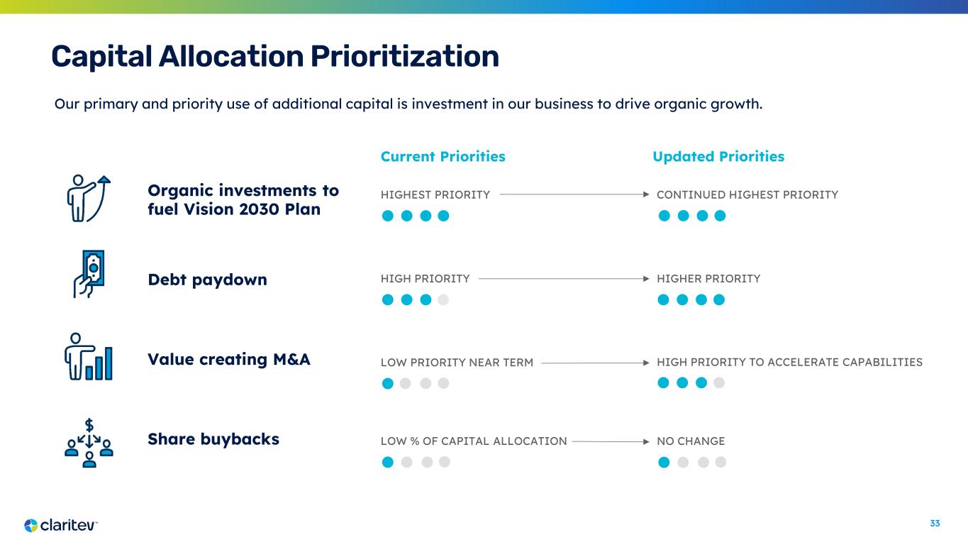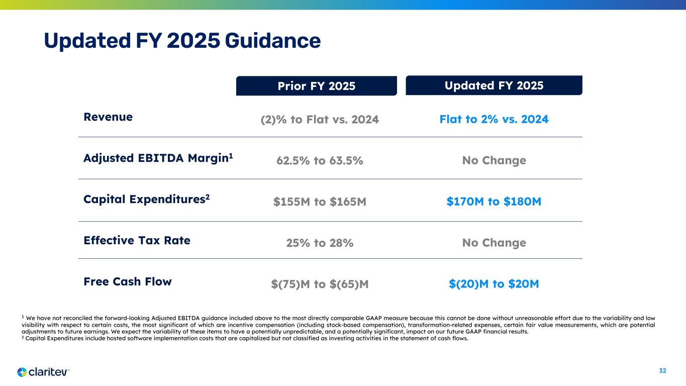 32 1 We have not reconciled the forward-looking Adjusted EBITDA guidance included above to the most directly comparable GAAP measure because this cannot be done without unreasonable effort due to the variability and low visibility with respect to certain costs, the most significant of which are incentive compensation (including stock-based compensation), transformation-related expenses, certain fair value measurements, which are potential adjustments to future earnings. We expect the variability of these items to have a potentially unpredictable, and a potentially significant, impact on our future GAAP financial results. 2 Capital Expenditures include hosted software implementation costs that are capitalized but not classified as investing activities in the statement of cash flows. Revenue Adjusted EBITDA Margin1 Capital Expenditures2 Effective Tax Rate Free Cash Flow Flat to 2% vs. 2024 No Change $170M to $180M No Change $(20)M to $20M (2)% to Flat vs. 2024 62.5% to 63.5% $155M to $165M 25% to 28% $(75)M to $(65)M Prior FY 2025 Updated FY 2025 Updated FY 2025 Guidance
