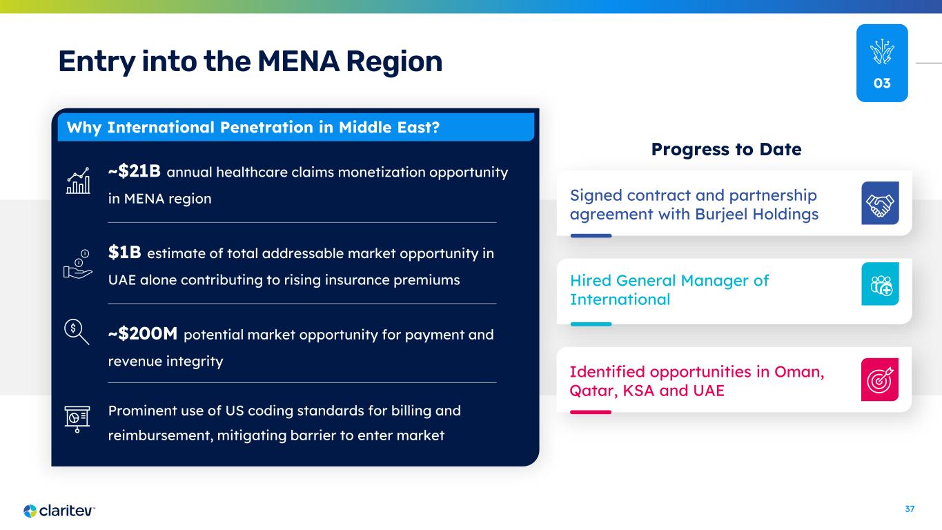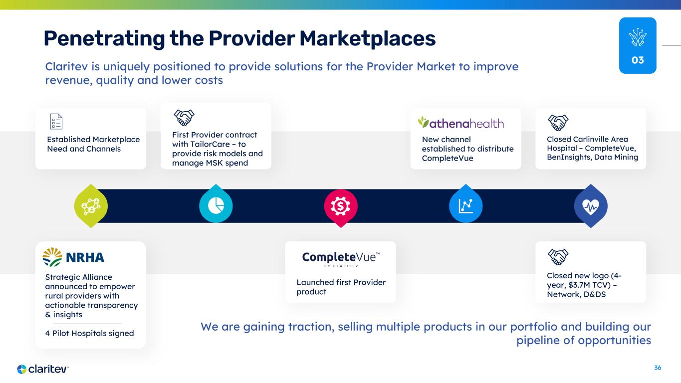 36 Penetrating the Provider Marketplaces 03 Established Marketplace Need and Channels First Provider contract with TailorCare – to provide risk models and manage MSK spend New channel established to distribute CompleteVue Closed Carlinville Area Hospital – CompleteVue, BenInsights, Data Mining Strategic Alliance announced to empower rural providers with actionable transparency & insights 4 Pilot Hospitals signed Launched first Provider product Claritev is uniquely positioned to provide solutions for the Provider Market to improve revenue, quality and lower costs Closed new logo (4- year, $3.7M TCV) – Network, D&DS We are gaining traction, selling multiple products in our portfolio and building our pipeline of opportunities