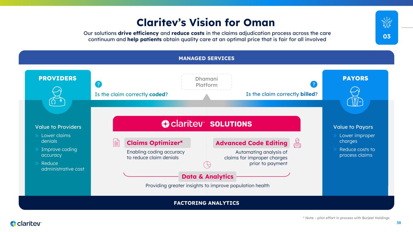 38 Claims Optimizer* Enabling coding accuracy to reduce claim denials PROVIDERS Dhamani Platform Claritev’s Vision for Oman Is the claim correctly billed?Is the claim correctly coded? Our solutions drive efficiency and reduce costs in the claims adjudication process across the care continuum and help patients obtain quality care at an optimal price that is fair for all involved SOLUTIONSValue to Providers Lower claims denials Improve coding accuracy Reduce administrative cost * Note – pilot effort in process with Burjeel Holdings FACTORING ANALYTICS MANAGED SERVICES PAYORS Value to Payors Lower improper charges Reduce costs to process claims Data & Analytics Providing greater insights to improve population health Advanced Code Editing Automating analysis of claims for improper charges prior to payment ?? 03
