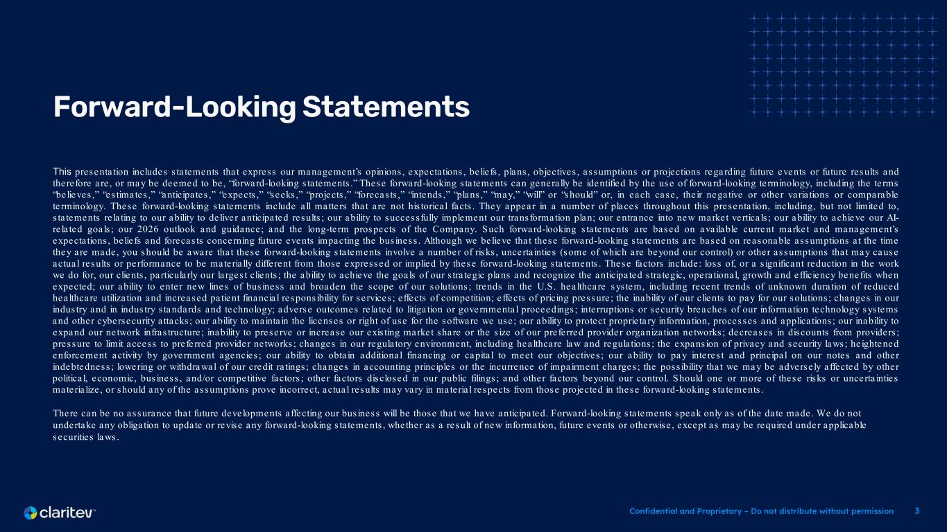 Confidential and Proprietary – Do not distribute without permission 3 Forward-Looking Statements This presenta tion includes s ta tements tha t express our management’s opinions , expectations , be lie fs , plans , objectives , as sumptions or projections regarding future events or future results and therefore a re , or may be deemed to be , “forward-looking s ta tements .” These forward-looking s ta tements can genera lly be identified by the use of forward-looking te rminology, including the te rms “be lieves ,” “es timates ,” “anticipa tes ,” “expects ,” “seeks ,” “projects ,” “forecas ts ,” “intends ,” “plans ,” “may,” “will” or “should” or, in each case, the ir nega tive or other varia tions or comparable te rminology. These forward-looking s ta tements include a ll matte rs tha t a re not his torica l facts . They appear in a number of places throughout this presenta tion, including, but not limited to, s ta tements re la ting to our ability to de liver anticipa ted results ; our ability to successfully implement our trans formation plan; our entrance into new marke t vertica ls ; our ability to achieve our AI- re la ted goa ls ; our 2026 outlook and guidance ; and the long-te rm prospects of the Company. Such forward-looking s ta tements a re based on ava ilable current marke t and management’s expectations , be lie fs and forecas ts concerning future events impacting the bus iness . Although we be lieve tha t these forward-looking s ta tements a re based on reasonable as sumptions a t the time they a re made , you should be aware tha t these forward-looking s tatements involve a number of risks , uncerta inties (some of which a re beyond our control) or other as sumptions tha t may cause actua l results or performance to be materia lly diffe rent from those expressed or implied by these forward-looking s ta tements . These factors include : loss of, or a s ignificant reduction in the work we do for, our clients , particula rly our la rges t clients ; the ability to achieve the goa ls of our s tra tegic plans and recognize the anticipa ted s tra tegic, opera tiona l, growth and efficiency benefits when expected; our ability to enter new lines of bus iness and broaden the scope of our solutions ; trends in the U.S. hea lthcare s ys tem, including recent trends of unknown dura tion of reduced hea lthcare utiliza tion and increased pa tient financia l respons ibility for se rvices ; effects of competition; e ffects of pricing pressure ; the inability of our clients to pay for our solutions ; changes in our indus try and in indus try s tandards and technology; adverse outcomes re la ted to litiga tion or governmenta l proceedings ; inte rruptions or security breaches of our information technology s ys tems and other cybersecurity a ttacks ; our ability to mainta in the licenses or right of use for the software we use ; our ability to protect proprie ta ry information, processes and applica tions ; our inability to expand our ne twork infras tructure ; inability to preserve or increase our exis ting marke t share or the s ize of our preferred provider organiza tion ne tworks ; decreases in discounts from providers ; pressure to limit access to preferred provider ne tworks ; changes in our regula tory environment, including hea lthcare law and regula tions ; the expans ion of privacy and security laws ; he ightened enforcement activity by government agencies ; our ability to obta in additiona l financing or capita l to meet our objectives ; our ability to pa y inte res t and principa l on our notes and other indebtedness ; lowering or withdrawa l of our credit ra tings ; changes in accounting principles or the incurrence of impairment charges ; the poss ibility tha t we may be adverse ly a ffected by other politica l, economic, bus iness , and/or competitive factors ; other factors disclosed in our public filings ; and other factors beyond our control. Should one or more of these risks or uncerta inties materia lize , or should any of the as sumptions prove incorrect, actua l results may vary in materia l respects from those projected in these forward-looking s ta tements . There can be no assurance tha t future deve lopments a ffecting our bus iness will be those tha t we have anticipa ted. Forward-looking s ta tements speak only as of the da te made . We do not undertake any obliga tion to update or revise any forward-looking s ta tements , whether as a result of new information, future events or otherwise , except as may be required under applicable securities laws .