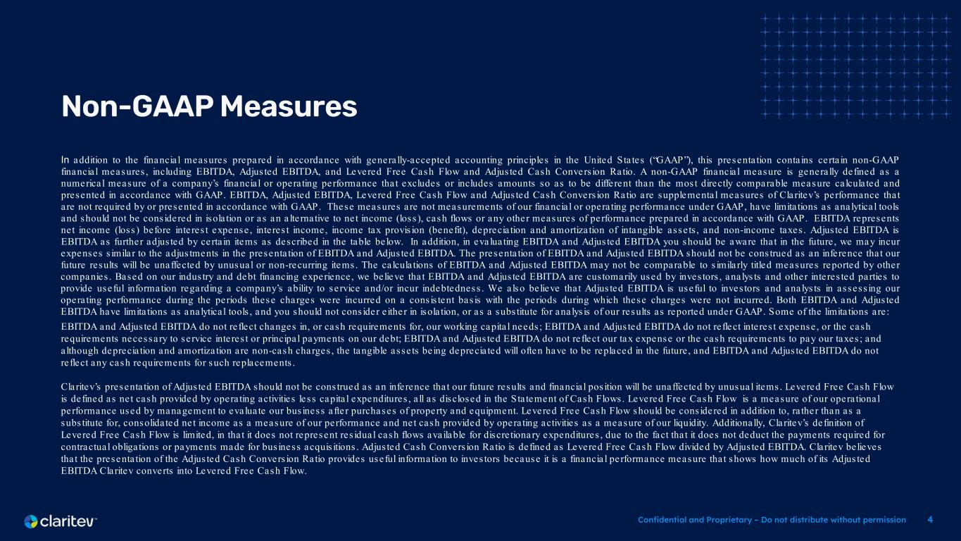 Confidential and Proprietary – Do not distribute without permission 4 Non-GAAP Measures In addition to the financia l measures prepared in accordance with genera lly-accepted accounting principles in the United Sta tes (“GAAP”), this presenta tion conta ins certa in non-GAAP financia l measures , including EBITDA, Adjus ted EBITDA, and Levered Free Cash Flow and Adjus ted Cash Convers ion Ratio. A non-GAAP financia l measure is genera lly defined as a numerica l measure of a company’s financia l or operating performance tha t excludes or includes amounts so as to be diffe rent than the mos t directly comparable measure ca lcula ted and presented in accordance with GAAP. EBITDA, Adjus ted EBITDA, Levered Free Cash Flow and Adjus ted Cash Convers ion Ratio a re supplementa l measures of Claritev’s performance tha t a re not required by or presented in accordance with GAAP. These measures a re not measurements of our financia l or opera ting performance under GAAP, have limita tions as ana lytica l tools and should not be cons idered in isola tion or as an a lte rna tive to ne t income (loss ), cash flows or any other measures of performance prepared in accordance with GAAP. EBITDA represents ne t income (loss ) before inte res t expense , inte res t income, income tax provis ion (benefit), deprecia tion and amortiza tion of intangible as se ts , and non-income taxes . Adjus ted EBITDA is EBITDA as further adjus ted by certa in items as described in the table be low. In addition, in eva lua ting EBITDA and Adjus ted EBITDA you should be aware tha t in the future , we may incur expenses s imila r to the adjus tments in the presenta tion of EBITDA and Adjus ted EBITDA. The presenta tion of EBITDA and Adjus ted EBITDA should not be cons trued as an inference tha t our future results will be unaffected by unusua l or non-recurring items . The ca lcula tions of EBITDA and Adjus ted EBITDA may not be comparable to s imila rly titled measures reported by other companies . Based on our indus try and debt financing experience , we be lieve tha t EBITDA and Adjus ted EBITDA are cus tomarily used by inves tors , ana lys ts and other inte res ted parties to provide useful information regarding a company’s ability to se rvice and/or incur indebtedness . We a lso be lieve tha t Adjus ted EBITDA is useful to inves tors and ana lys ts in as sess ing our opera ting performance during the periods these charges were incurred on a cons is tent bas is with the periods during which these charges were not incurred. Both EBITDA and Adjus ted EBITDA have limita tions as ana lytica l tools , and you should not cons ider e ither in isola tion, or as a subs titute for ana lys is of our results as reported under GAAP. Some of the limita tions a re : ​EBITDA and Adjus ted EBITDA do not re flect changes in, or cash requirements for, our working capita l needs ; EBITDA and Adjus ted EBITDA do not re flect inte res t expense , or the cash requirements necessary to se rvice inte res t or principa l payments on our debt; EBITDA and Adjus ted EBITDA do not re flect our tax expense or the cash requirements to pay our taxes ; and a lthough deprecia tion and amortiza tion a re non-cash charges , the tangible as se ts be ing deprecia ted will often have to be replaced in the future , and EBITDA and Adjus ted EBITDA do not re flect any cash requirements for such replacements . Claritev’s presenta tion of Adjus ted EBITDA should not be cons trued as an inference tha t our future results and financia l pos ition will be unaffected by unusua l items . Levered Free Cash Flow is defined as ne t cash provided by opera ting activities les s capita l expenditures , a ll as disclosed in the Sta tement of Cash Flows . Levered Free Cash Flow is a measure of our opera tiona l performance used by management to eva lua te our bus iness a fte r purchases of property and equipment. Levered Free Cash Flow should be cons idered in addition to, ra ther than as a subs titute for, consolida ted ne t income as a measure of our performance and ne t cash provided by opera ting activities as a measure of our liquidity. Additiona lly, Claritev’s definition of Levered Free Cash Flow is limited, in tha t it does not represent res idua l cash flows ava ilable for discre tionary expenditures , due to the fact tha t it does not deduct the payments required for contractua l obliga tions or payments made for bus iness acquis itions . Adjus ted Cash Convers ion Ratio is defined as Levered Free Cash Flow divided by Adjus ted EBITDA. Claritev be lieves tha t the presenta tion of the Adjus ted Cash Convers ion Ratio provides useful information to inves tors because it is a financia l performance measure tha t shows how much of its Adjus ted EBITDA Claritev converts into Levered Free Cash Flow.