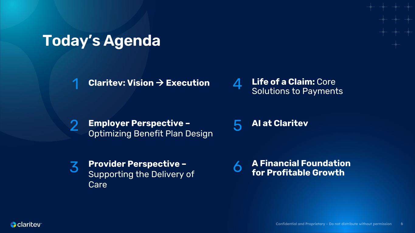 Confidential and Proprietary – Do not distribute without permission 6 1 Claritev: Vision  Execution 2 3 4 Life of a Claim: Core Solutions to Payments 5 AI at Claritev 6 A Financial Foundation for Profitable Growth Today’s Agenda Employer Perspective – Optimizing Benefit Plan Design Provider Perspective – Supporting the Delivery of Care