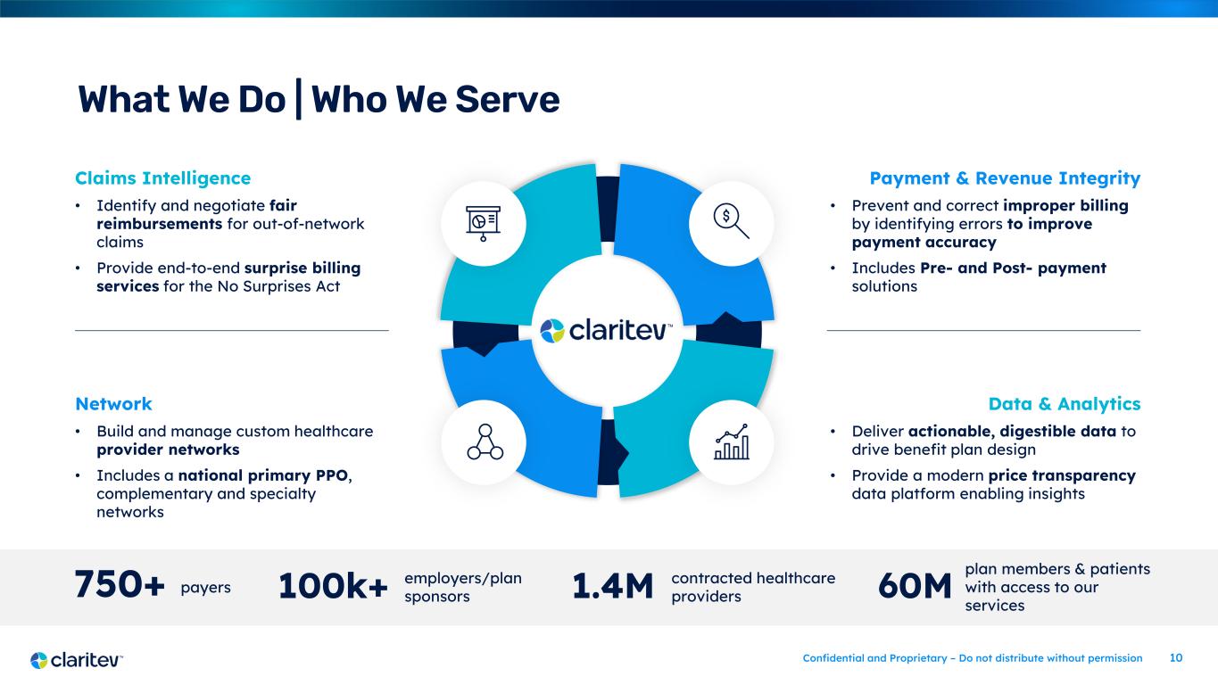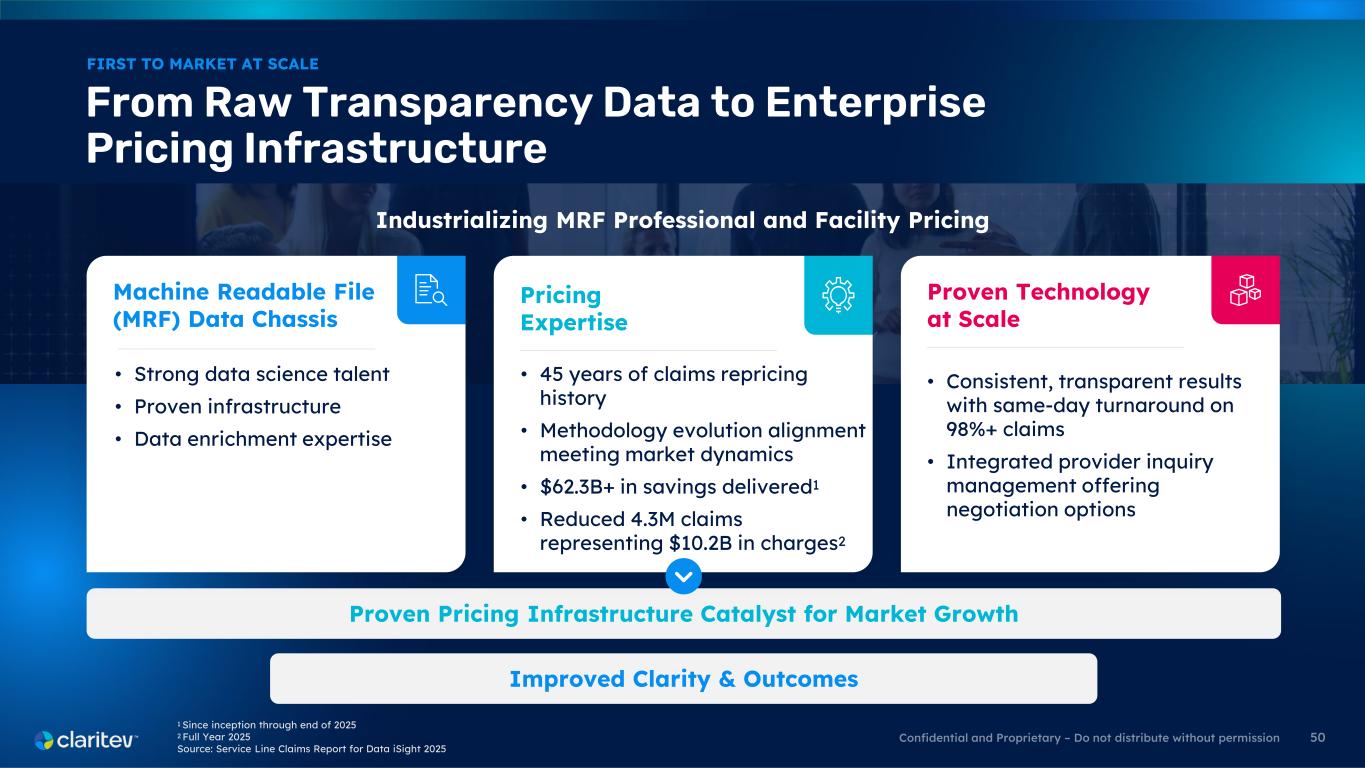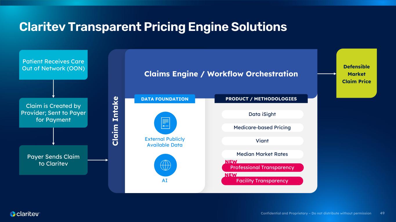 Confidential and Proprietary – Do not distribute without permission 49 Claritev Transparent Pricing Engine Solutions Cl ai m I nt ak e External Publicly Available Data AI Claims Engine / Workflow Orchestration PRODUCT / METHODOLOGIES Patient Receives Care Out of Network (OON) Claim is Created by Provider; Sent to Payer for Payment Payer Sends Claim to Claritev DATA FOUNDATION Defensible Market Claim Price Data iSight Medicare-based Pricing Viant Median Market Rates Professional Transparency Facility Transparency NEW NEW