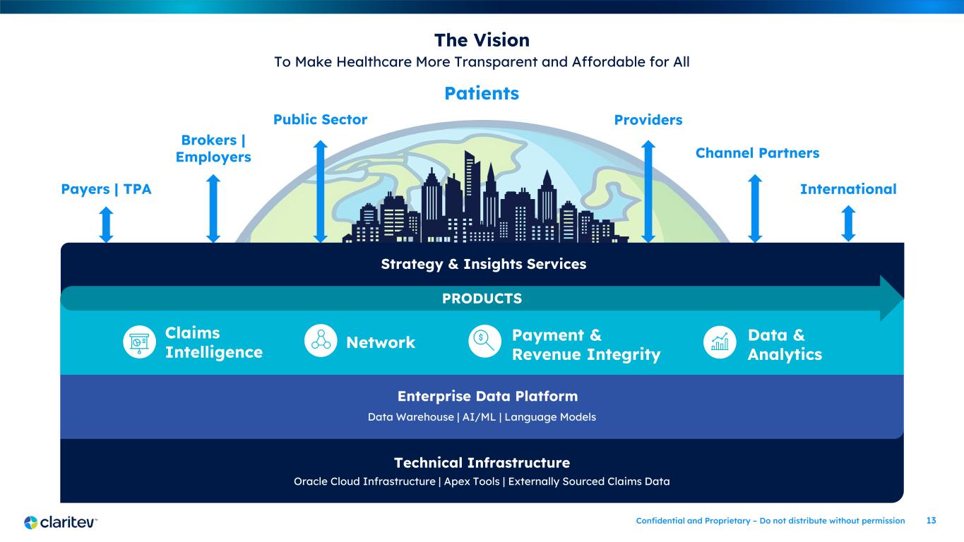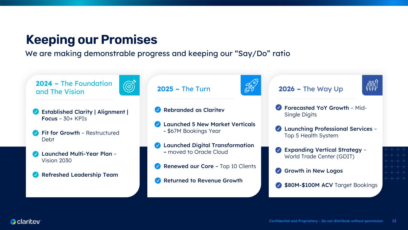 Confidential and Proprietary – Do not distribute without permission 12 Keeping our Promises Established Clarity | Alignment | Focus – 30+ KPIs Fit for Growth – Restructured Debt Launched Multi-Year Plan – Vision 2030 Refreshed Leadership Team 2024 – The Foundation and The Vision Rebranded as Claritev Launched 5 New Market Verticals - $67M Bookings Year Launched Digital Transformation – moved to Oracle Cloud Renewed our Core – Top 10 Clients Returned to Revenue Growth 2025 – The Turn We are making demonstrable progress and keeping our “Say/Do” ratio Forecasted YoY Growth – Mid- Single Digits Launching Professional Services – Top 5 Health System Expanding Vertical Strategy – World Trade Center (GDIT) Growth in New Logos $80M-$100M ACV Target Bookings 2026 – The Way Up