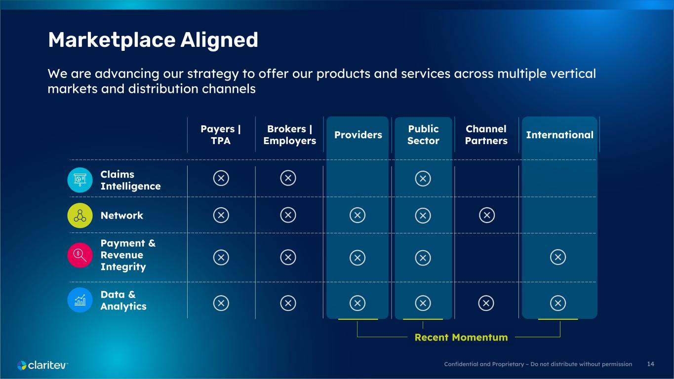 Confidential and Proprietary – Do not distribute without permission 13 The Vision To Make Healthcare More Transparent and Affordable for All Patients Payers | TPA Brokers | Employers Public Sector Channel Partners Providers International Enterprise Data Platform Data Warehouse | AI/ML | Language Models Technical Infrastructure Oracle Cloud Infrastructure | Apex Tools | Externally Sourced Claims Data Strategy & Insights Services PRODUCTS Network Payment & Revenue Integrity Data & Analytics Claims Intelligence