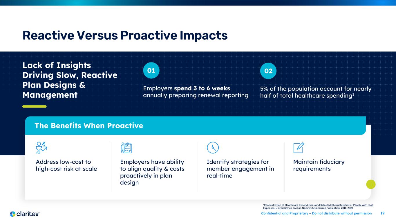 Confidential and Proprietary – Do not distribute without permission 18 Benefit Plan Management Challenges Have Never Been Greater Expected Increase of total health benefits spend per employee1 1 https://www.mercer.com/en-us/insights/us-health-news/employers-prepare-for-the-highest-health-benefit-cost-increase-in-15-years/ *Benefit plan designs and changes are the responsibility of the plan sponsor. Claritev only provides insights to aid in the process Reducing healthcare spend Disparate data sources and various platforms Benefits design changes without holistic view of the impact Point solution burn-out with lack of data-backed decisions Complexity of the benefits ecosystem impact ROI of benefit decisions and maintaining fiduciary compliance Emerging population risks with unclear line of sight 6.5%