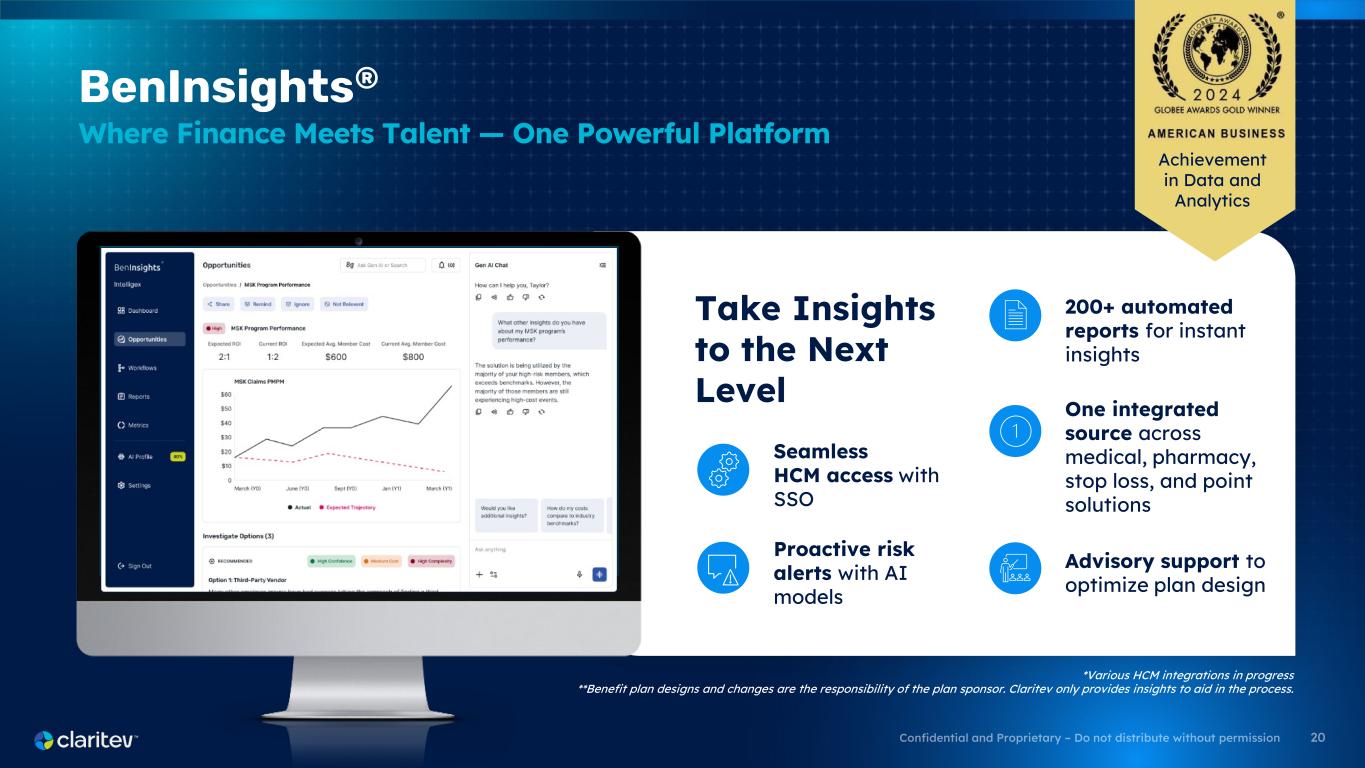 Confidential and Proprietary – Do not distribute without permission 20 Where Finance Meets Talent — One Powerful Platform BenInsights® Proactive risk alerts with AI models One integrated source across medical, pharmacy, stop loss, and point solutions Seamless HCM access with SSO 200+ automated reports for instant insights Advisory support to optimize plan design *Various HCM integrations in progress **Benefit plan designs and changes are the responsibility of the plan sponsor. Claritev only provides insights to aid in the process. Achievement in Data and Analytics Take Insights to the Next Level