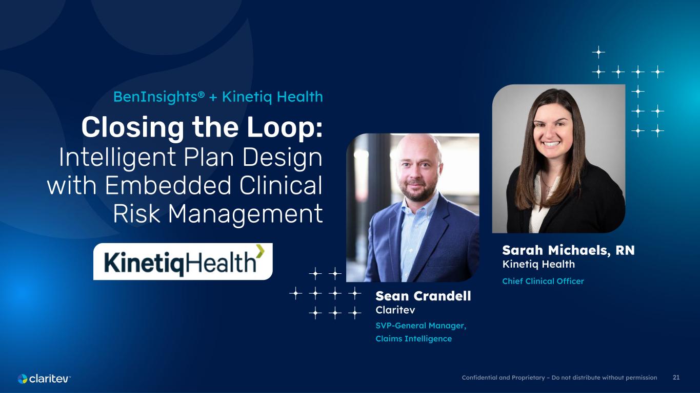 Confidential and Proprietary – Do not distribute without permission 21 Chief Clinical Officer Sean Crandell Claritev SVP-General Manager, Claims Intelligence Sarah Michaels, RN Kinetiq Health Closing the Loop: Intelligent Plan Design with Embedded Clinical Risk Management BenInsights® + Kinetiq Health