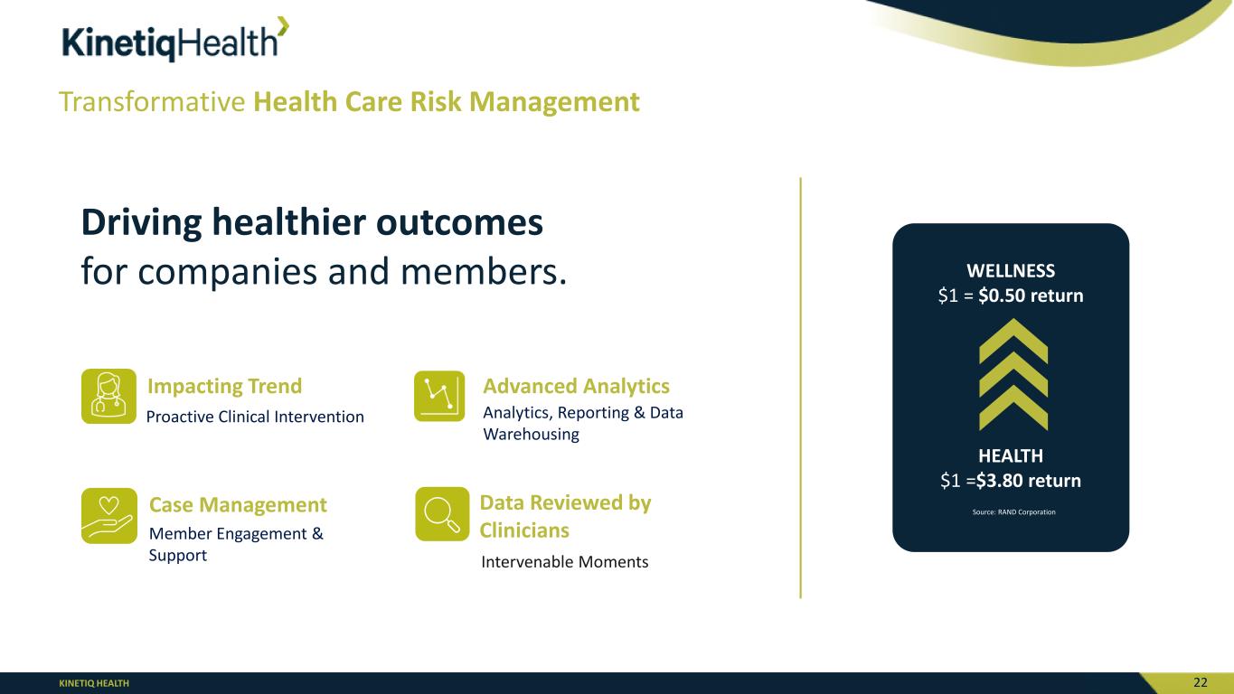22KINETIQ HEALTH Impacting Trend Case Management Member Engagement & Support Proactive Clinical Intervention Advanced Analytics Analytics, Reporting & Data Warehousing Data Reviewed by Clinicians Intervenable Moments WELLNESS $1 = $0.50 return HEALTH $1 =$3.80 return Source: RAND Corporation Transformative Health Care Risk Management Driving healthier outcomes for companies and members.