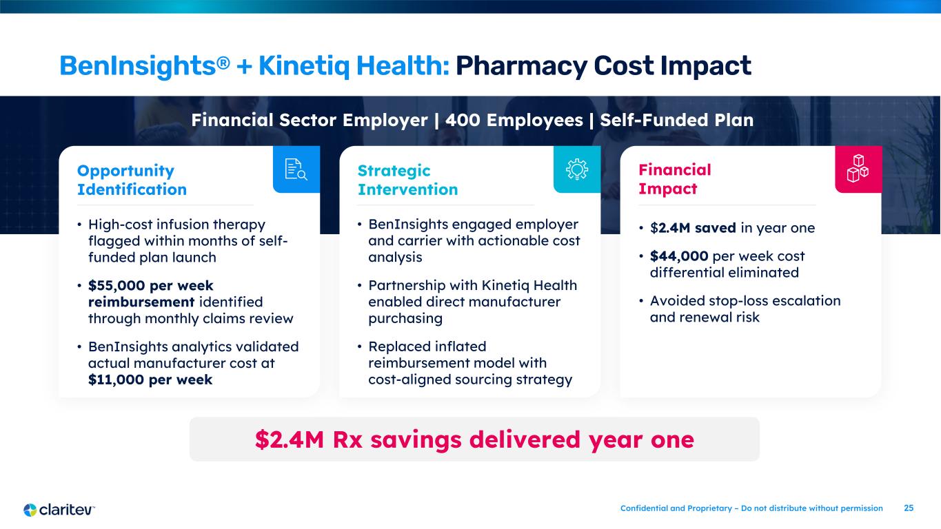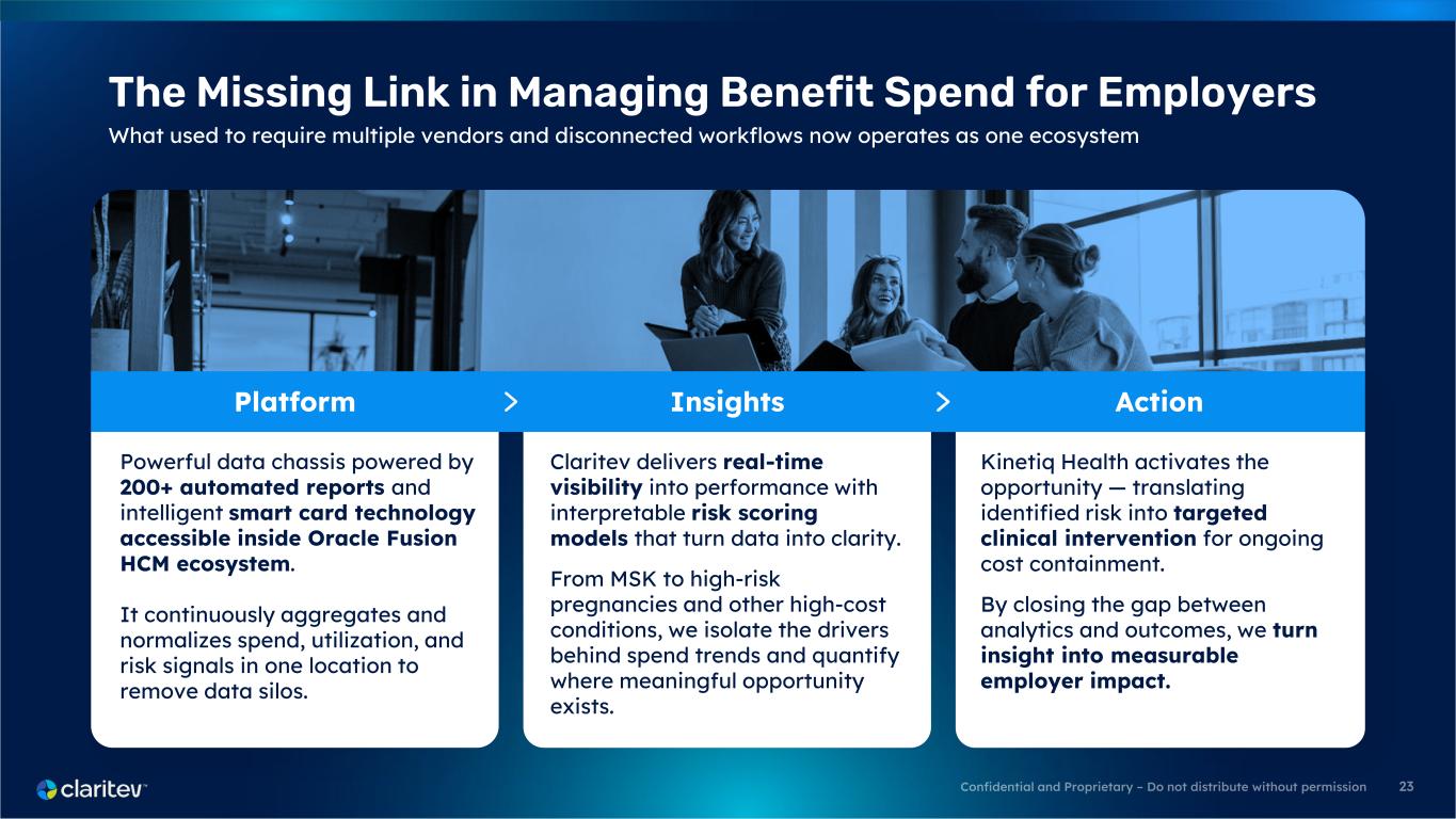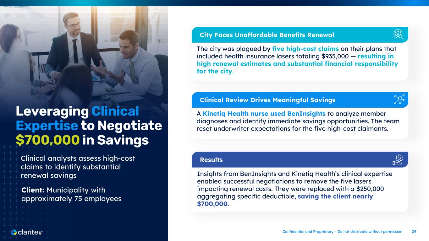 Confidential and Proprietary – Do not distribute without permission 23 The Missing Link in Managing Benefit Spend for Employers What used to require multiple vendors and disconnected workflows now operates as one ecosystem Powerful data chassis powered by 200+ automated reports and intelligent smart card technology accessible inside Oracle Fusion HCM ecosystem. It continuously aggregates and normalizes spend, utilization, and risk signals in one location to remove data silos. Claritev delivers real-time visibility into performance with interpretable risk scoring models that turn data into clarity. From MSK to high-risk pregnancies and other high-cost conditions, we isolate the drivers behind spend trends and quantify where meaningful opportunity exists. Kinetiq Health activates the opportunity — translating identified risk into targeted clinical intervention for ongoing cost containment. By closing the gap between analytics and outcomes, we turn insight into measurable employer impact. ActionInsightsPlatform