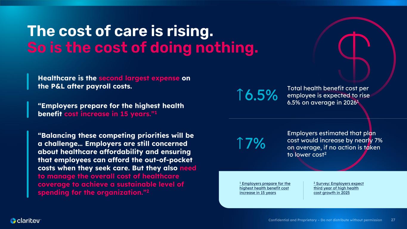 Confidential and Proprietary – Do not distribute without permission 27 The cost of care is rising. So is the cost of doing nothing. 6.5% Total health benefit cost per employee is expected to rise 6.5% on average in 20261 7% Employers estimated that plan cost would increase by nearly 7% on average, if no action is taken to lower cost2 2 Survey: Employers expect third year of high health cost growth in 2025 1 Employers prepare for the highest health benefit cost increase in 15 years “Employers prepare for the highest health benefit cost increase in 15 years.”1 Healthcare is the second largest expense on the P&L after payroll costs. “Balancing these competing priorities will be a challenge… Employers are still concerned about healthcare affordability and ensuring that employees can afford the out-of-pocket costs when they seek care. But they also need to manage the overall cost of healthcare coverage to achieve a sustainable level of spending for the organization.”2