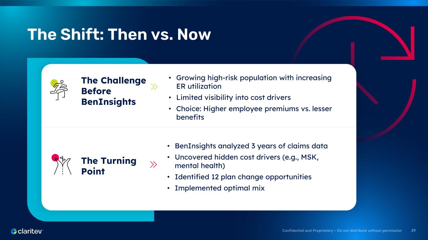Confidential and Proprietary – Do not distribute without permission 29 The Shift: Then vs. Now • Growing high-risk population with increasing ER utilization • Limited visibility into cost drivers • Choice: Higher employee premiums vs. lesser benefits The Challenge Before BenInsights • BenInsights analyzed 3 years of claims data • Uncovered hidden cost drivers (e.g., MSK, mental health) • Identified 12 plan change opportunities • Implemented optimal mix The Turning Point