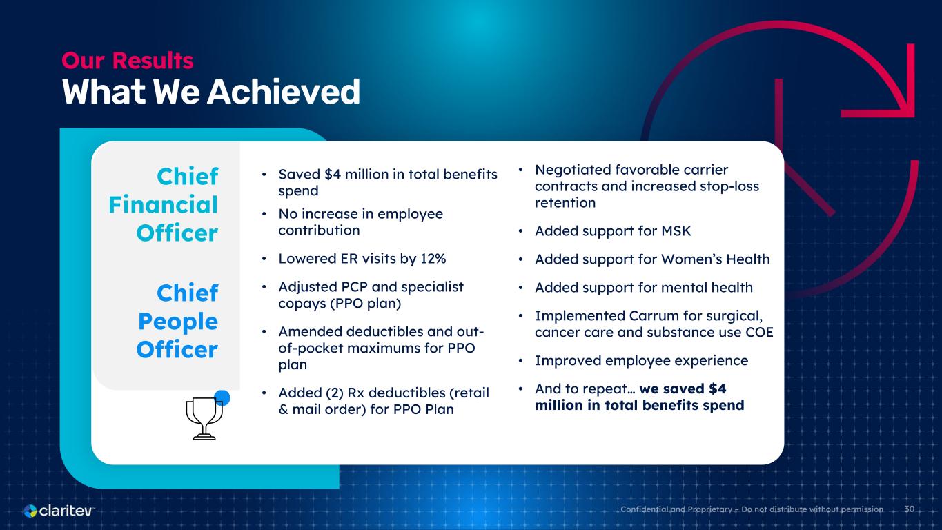 Confidential and Proprietary – Do not distribute without permission 30 Our Results What We Achieved Chief People Officer Chief Financial Officer • No increase in employee contribution • Lowered ER visits by 12% • Adjusted PCP and specialist copays (PPO plan) • Amended deductibles and out- of-pocket maximums for PPO plan • Added (2) Rx deductibles (retail & mail order) for PPO Plan • Negotiated favorable carrier contracts and increased stop-loss retention • Added support for MSK • Added support for Women’s Health • Added support for mental health • Implemented Carrum for surgical, cancer care and substance use COE • Improved employee experience • And to repeat… we saved $4 million in total benefits spend • Saved $4 million in total benefits spend