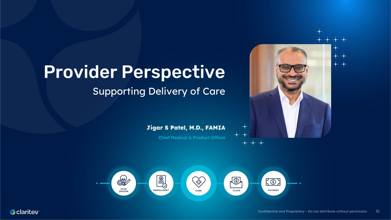 Confidential and Proprietary – Do not distribute without permission 31 Provider Perspective Supporting Delivery of Care Jigar S Patel, M.D., FAMIA Chief Medical & Product Officer