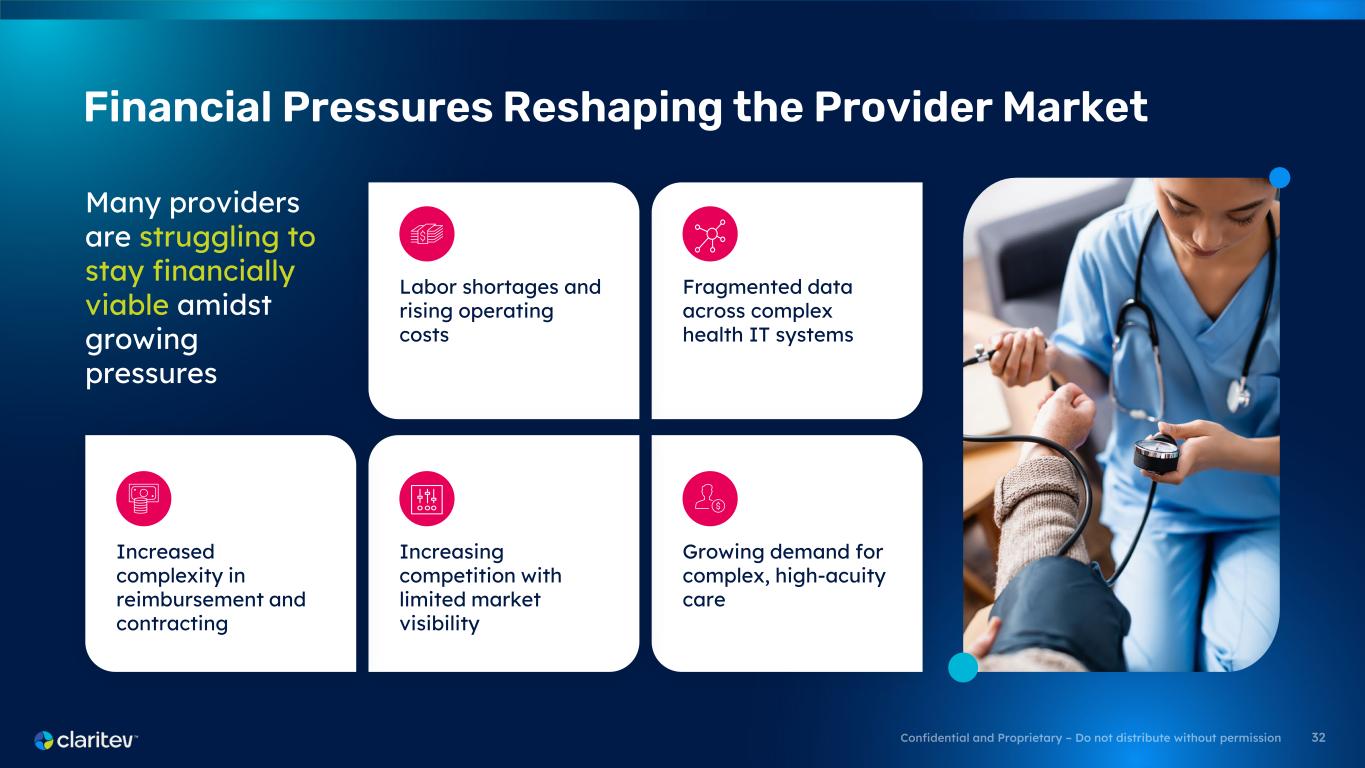 Confidential and Proprietary – Do not distribute without permission 32 Financial Pressures Reshaping the Provider Market Many providers are struggling to stay financially viable amidst growing pressures Labor shortages and rising operating costs Fragmented data across complex health IT systems Increased complexity in reimbursement and contracting Increasing competition with limited market visibility Growing demand for complex, high-acuity care