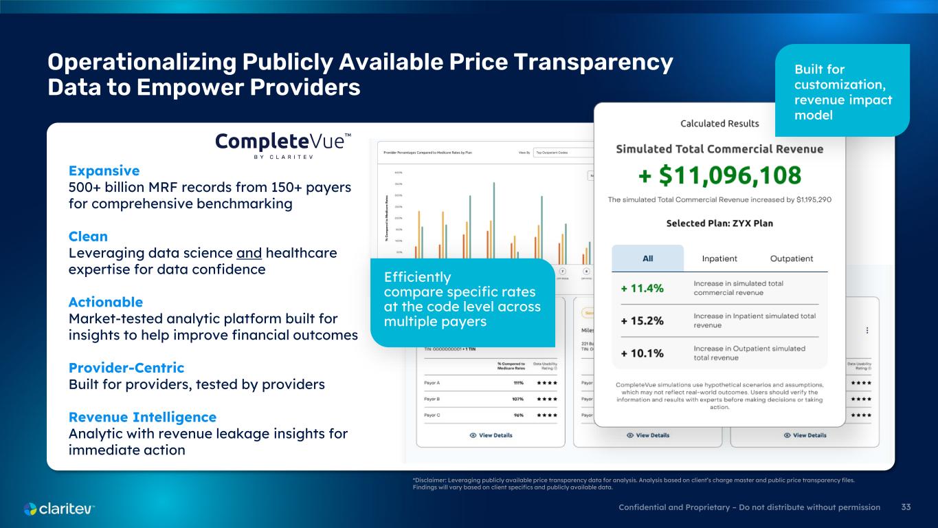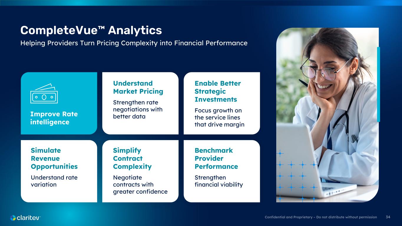Confidential and Proprietary – Do not distribute without permission 33 Operationalizing Publicly Available Price Transparency Data to Empower Providers Expansive 500+ billion MRF records from 150+ payers for comprehensive benchmarking Clean Leveraging data science and healthcare expertise for data confidence Actionable Market-tested analytic platform built for insights to help improve financial outcomes Provider-Centric Built for providers, tested by providers Revenue Intelligence Analytic with revenue leakage insights for immediate action Built for customization, revenue impact model *Disclaimer: Leveraging publicly available price transparency data for analysis. Analysis based on client’s charge master and public price transparency files. Findings will vary based on client specifics and publicly available data. Efficiently compare specific rates at the code level across multiple payers