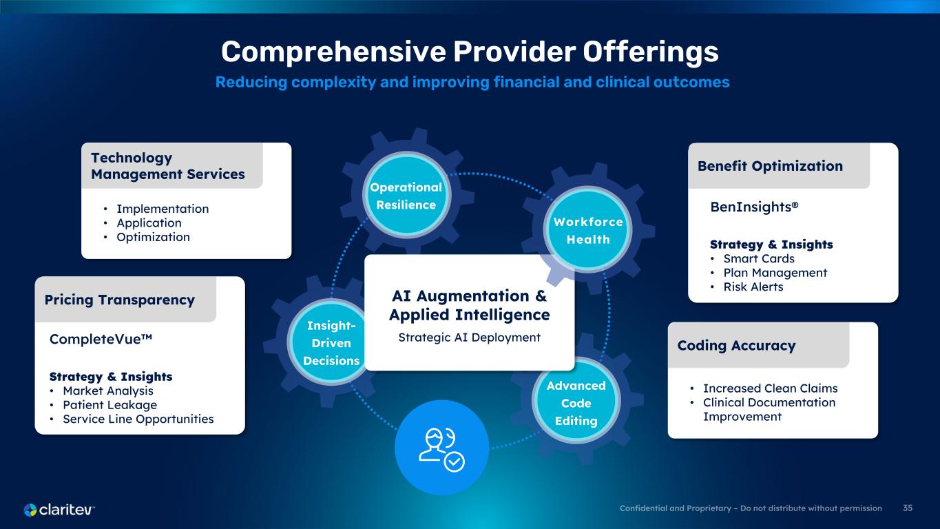 Confidential and Proprietary – Do not distribute without permission 34 CompleteVue Analytics Helping Providers Turn Pricing Complexity into Financial Performance Understand Market Pricing Strengthen rate negotiations with better data Enable Better Strategic Investments Focus growth on the service lines that drive margin Simulate Revenue Opportunities Understand rate variation Simplify Contract Complexity Negotiate contracts with greater confidence Benchmark Provider Performance Strengthen financial viability Improve Rate intelligence