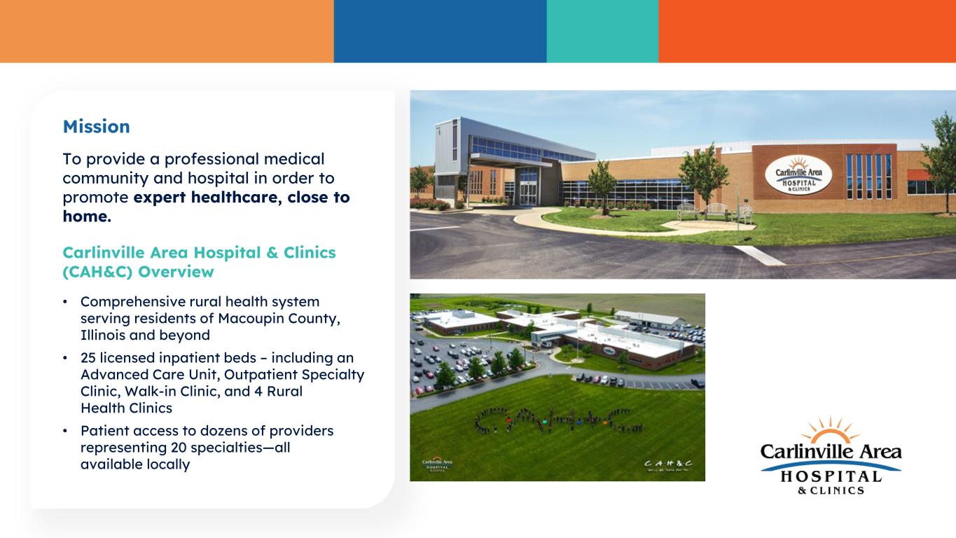 Mission To provide a professional medical community and hospital in order to promote expert healthcare, close to home. Carlinville Area Hospital & Clinics (CAH&C) Overview • Comprehensive rural health system serving residents of Macoupin County, Illinois and beyond • 25 licensed inpatient beds – including an Advanced Care Unit, Outpatient Specialty Clinic, Walk-in Clinic, and 4 Rural Health Clinics • Patient access to dozens of providers representing 20 specialties—all available locally