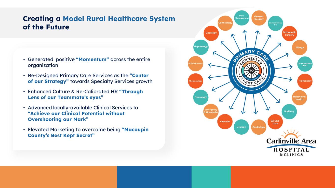 • Generated positive “Momentum” across the entire organization • Re-Designed Primary Care Services as the “Center of our Strategy” towards Specialty Services growth • Enhanced Culture & Re-Calibrated HR “Through Lens of our Teammate’s eyes” • Advanced locally-available Clinical Services to “Achieve our Clinical Potential without Overshooting our Mark” • Elevated Marketing to overcome being “Macoupin County’s Best Kept Secret” Creating a Model Rural Healthcare System of the Future