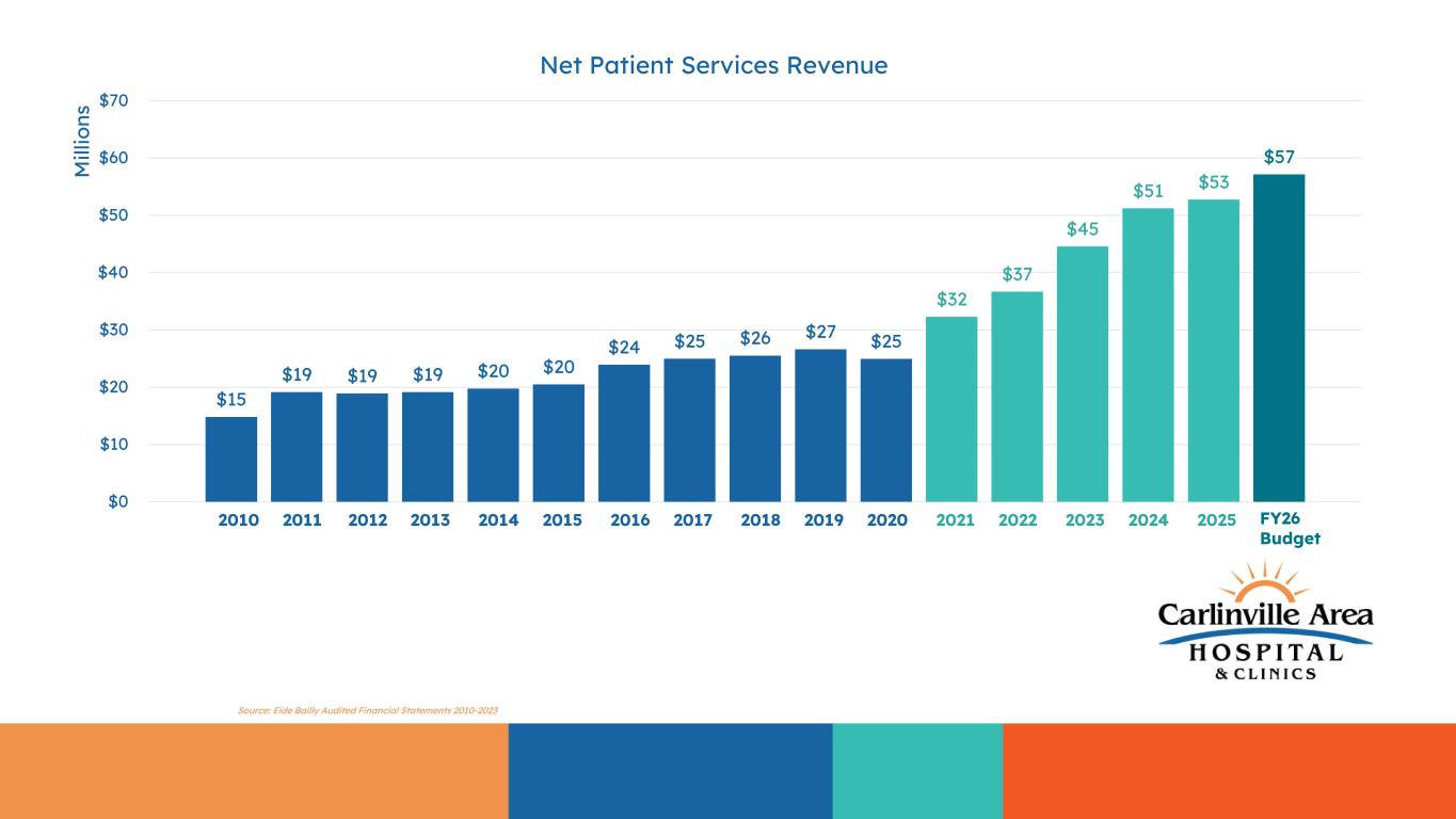 $15 $19 $19 $19 $20 $20 $24 $25 $26 $27 $25 $32 $37 $45 $51 $53 $57 $0 $10 $20 $30 $40 $50 $60 $70 M ill io ns Net Patient Services Revenue 2010 2011 2012 2013 2014 2015 2016 2017 2018 2019 2020 2021 2022 2023 2024 2025 FY26 Budget Source: Eide Bailly Audited Financial Statements 2010-2023