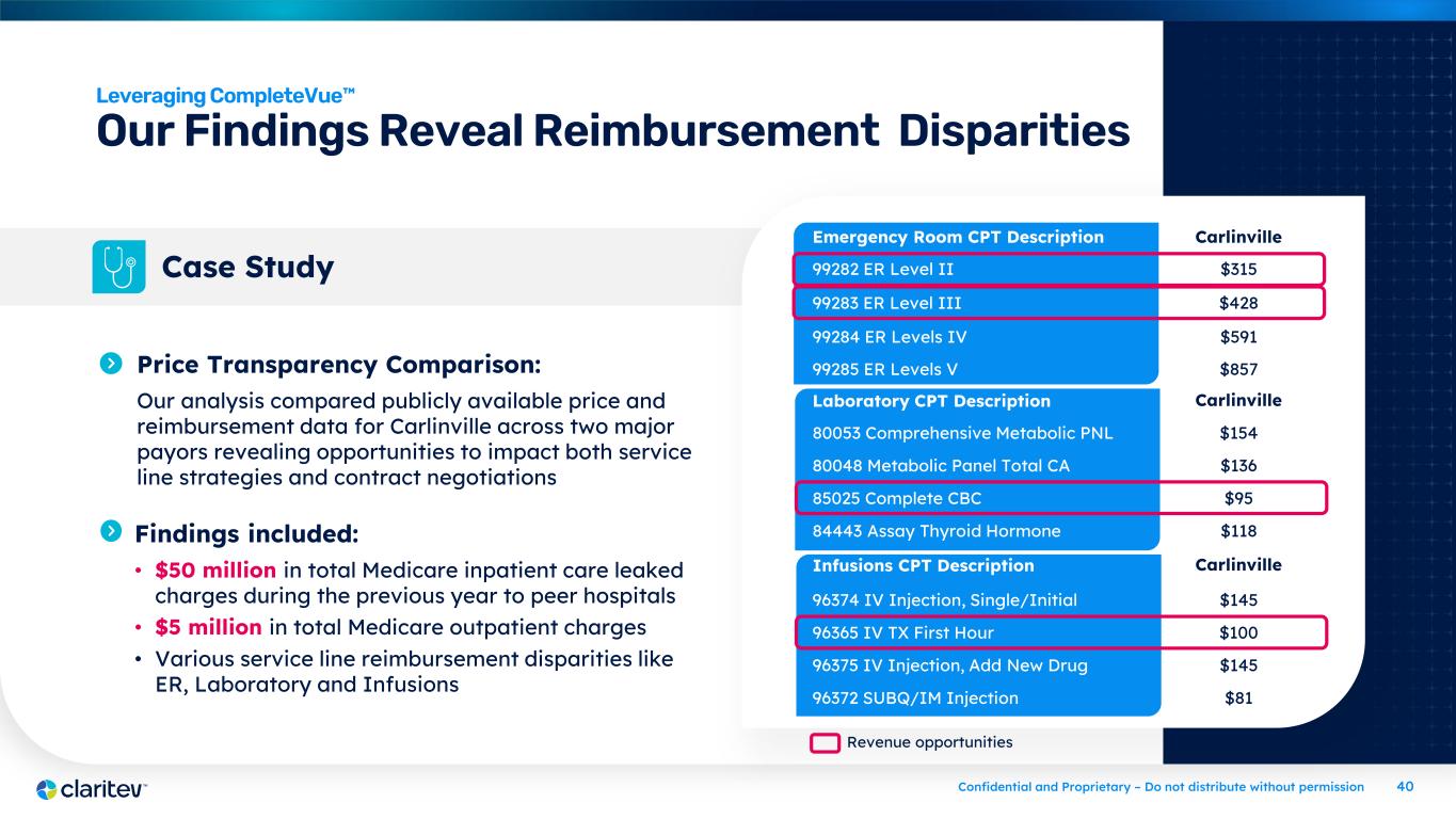 Confidential and Proprietary – Do not distribute without permission 40 Case Study Price Transparency Comparison: Our analysis compared publicly available price and reimbursement data for Carlinville across two major payors revealing opportunities to impact both service line strategies and contract negotiations Findings included: • $50 million in total Medicare inpatient care leaked charges during the previous year to peer hospitals • $5 million in total Medicare outpatient charges • Various service line reimbursement disparities like ER, Laboratory and Infusions Emergency Room CPT Description Carlinville 99282 ER Level II $315 99283 ER Level III $428 99284 ER Levels IV $591 99285 ER Levels V $857 Laboratory CPT Description Carlinville 80053 Comprehensive Metabolic PNL $154 80048 Metabolic Panel Total CA $136 85025 Complete CBC $95 84443 Assay Thyroid Hormone $118 Infusions CPT Description Carlinville 96374 IV Injection, Single/Initial $145 96365 IV TX First Hour $100 96375 IV Injection, Add New Drug $145 96372 SUBQ/IM Injection $81 Leveraging CompleteVue Our Findings Reveal Reimbursement Disparities Revenue opportunities
