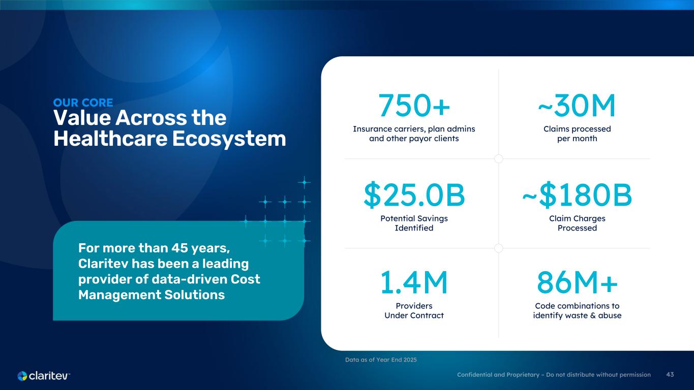 Confidential and Proprietary – Do not distribute without permission 43 86M+ Code combinations to identify waste & abuse ~30M Claims processed per month $25.0B Potential Savings Identified 1.4M Providers Under Contract 750+ Insurance carriers, plan admins and other payor clients ~$180B Claim Charges Processed For more than 45 years, Claritev has been a leading provider of data-driven Cost Management Solutions Data as of Year End 2025 OUR CORE Value Across the Healthcare Ecosystem