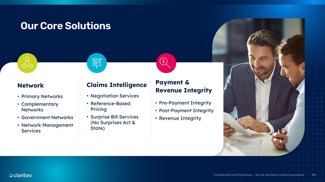 Confidential and Proprietary – Do not distribute without permission 44 Our Core Solutions Network • Primary Networks • Complementary Networks • Government Networks • Network Management Services Claims Intelligence • Negotiation Services • Reference-Based Pricing • Surprise Bill Services (No Surprises Act & State) Payment & Revenue Integrity • Pre-Payment Integrity • Post-Payment Integrity • Revenue Integrity