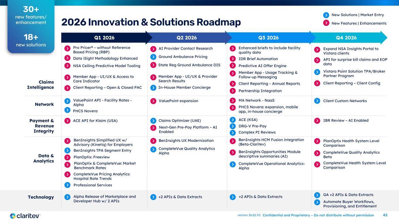 Confidential and Proprietary – Do not distribute without permission 45 Claims Intelligence Network Payment & Revenue Integrity Data & Analytics 2026 Innovation & Solutions Roadmap New Solutions | Market Entry New Features | Enhancements Claims Optimizer (UAE) Technology Alpha Release of Marketplace and Developer Hub w/ 2 APIs In-House Member Concierge Pro Pricer® – without Reference Based Pricing (RBP) NSA Ceiling Predictive Model Tooling Partnership Integration +2 APIs & Data Extracts +2 APIs & Data Extracts ValuePoint API - Facility Rates - Alpha PHCS Novera: expansion, mobile app, in-house conciergePHCS Novera Enhanced briefs to include facility quality data IDR Brief Automation ACE (KSA) MA Network - NaaS Ground Ambulance PricingData iSight Methodology Enhanced Member App - UI/UX & Access to Care Indicator GA +2 APIs & Data Extracts Client Reporting – Open & Closed PAC Client Custom NetworksValuePoint expansion Next-Gen Pre-Pay Platform – AI Enabled Vistara Point Solution TPA/Broker Partner Program IBR Review – AI Enabled Predictive AI Offer EngineState Reg Ground Ambulance DIS Expand NSA Insights Portal to Vistara clients ACE API for Klaim (USA) Member App - UI/UX & Provider Search Results Member App - Usage Tracking & Follow-up Messaging BenInsights UX Modernization CompleteVue Quality Analytics Alpha BenInsights Opportunities Module descriptive summaries (AI) BenInsights Simplified UX w/ Advisory (Kinetiq) for Employers PlanOptix: Freeview CompleteVue Pricing Analytics: Hospital Rate Trends PlanOptix Health System Level Comparison CompleteVue Quality Analytics Beta BenInsights TPA Segment Entry BenInsights HCM Fusion integration (Beta-Claritev) CompleteVue Operational Analytics- Alpha CompleteVue Health System Level Comparison Professional Services version 26.Q1.V2 AI Provider Contact Research API for surprise bill claims and EOP data Client Reporting – Client ConfigClient Reporting – Annual Reports PlanOptix & CompleteVue: Market Benchmark Rates DRG-V Pre-Pay Complex PI Reviews Automate Buyer Workflows, Provisioning, and Entitlement Q4 2026Q3 2026Q2 2026Q1 2026 30+ new features/ enhancement 18+ new solutions