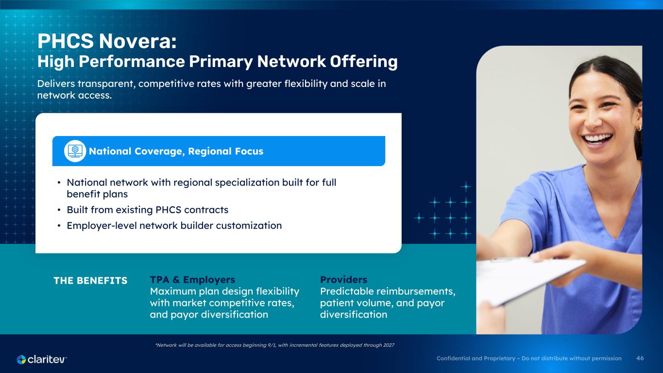 Confidential and Proprietary – Do not distribute without permission 46 PHCS Novera: High Performance Primary Network Offering Delivers transparent, competitive rates with greater flexibility and scale in network access. National Coverage, Regional Focus • National network with regional specialization built for full benefit plans • Built from existing PHCS contracts • Employer-level network builder customization *Network will be available for access beginning 9/1, with incremental features deployed through 2027 TPA & Employers Maximum plan design flexibility with market competitive rates, and payor diversification Providers Predictable reimbursements, patient volume, and payor diversification THE BENEFITS