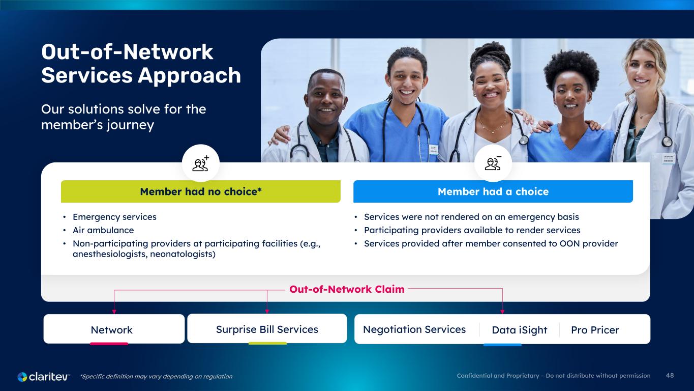 Confidential and Proprietary – Do not distribute without permission 48 Out-of-Network Services Approach • Emergency services • Air ambulance • Non-participating providers at participating facilities (e.g., anesthesiologists, neonatologists) Our solutions solve for the member’s journey Member had no choice* Member had a choice • Services were not rendered on an emergency basis • Participating providers available to render services • Services provided after member consented to OON provider Out-of-Network Claim Surprise Bill Services Negotiation Services Data iSight Pro Pricer *Specific definition may vary depending on regulation Network