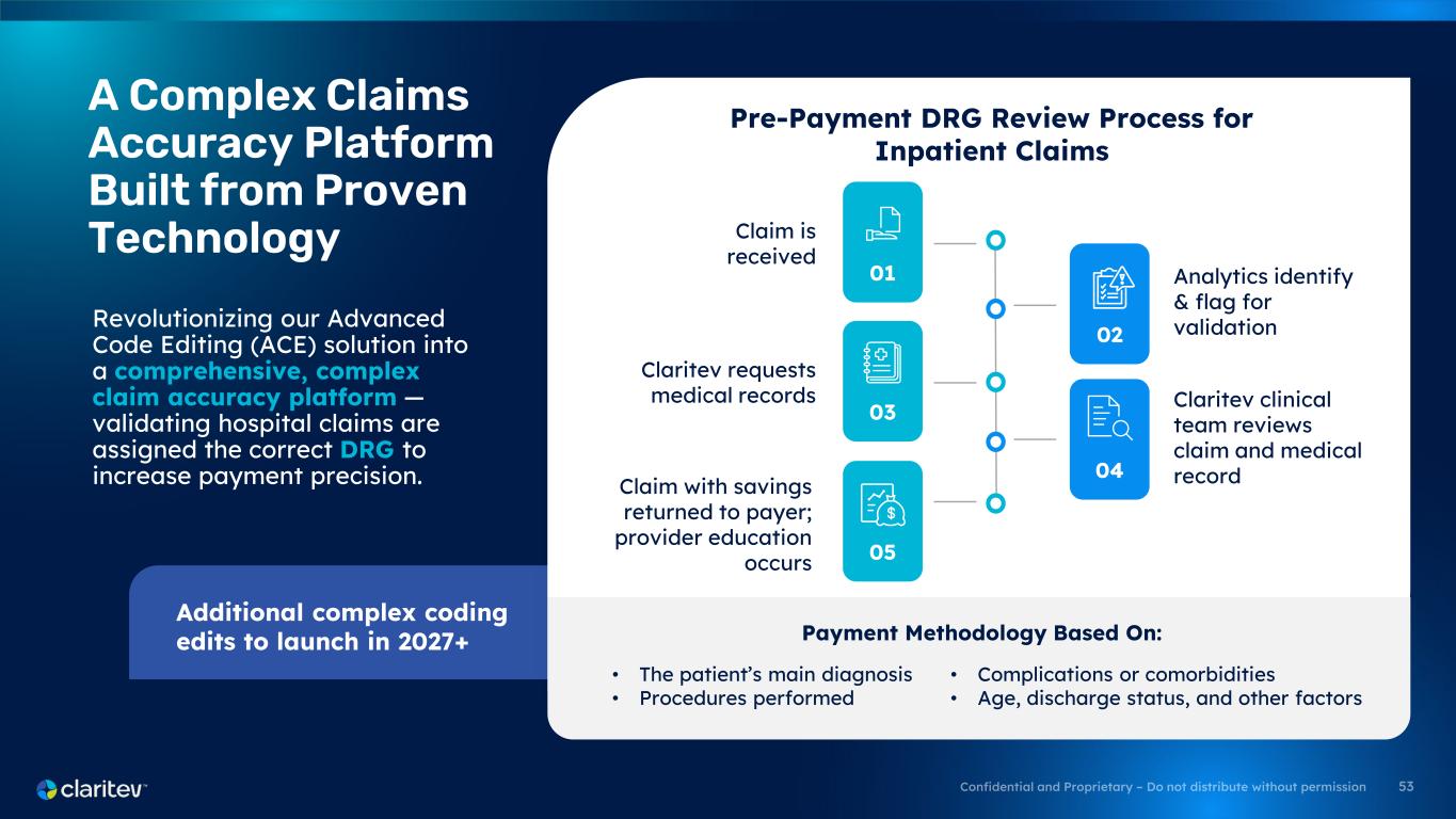 Confidential and Proprietary – Do not distribute without permission 52 How Claritev Supports the Life Cycle of a Claim Payment and Revenue Integrity Solutions Proven Foundation for New Innovations $1.8B Medical Cost Savings in Payment Integrity 2025 Pre-Pay Solutions Claim Received NEW Combines technology with expert review to identify complex coding and clinical issues before payment. Advanced Code Editing (ACE) Itemized Bill Review Diagnosis Related Grouping (DRG) Post-Pay Solutions Claim Paid Comprehensive, flexible solutions to recover inappropriate or overpayments after a claim is paid through advanced technology. Coordination of Benefits Data Mining Subrogation