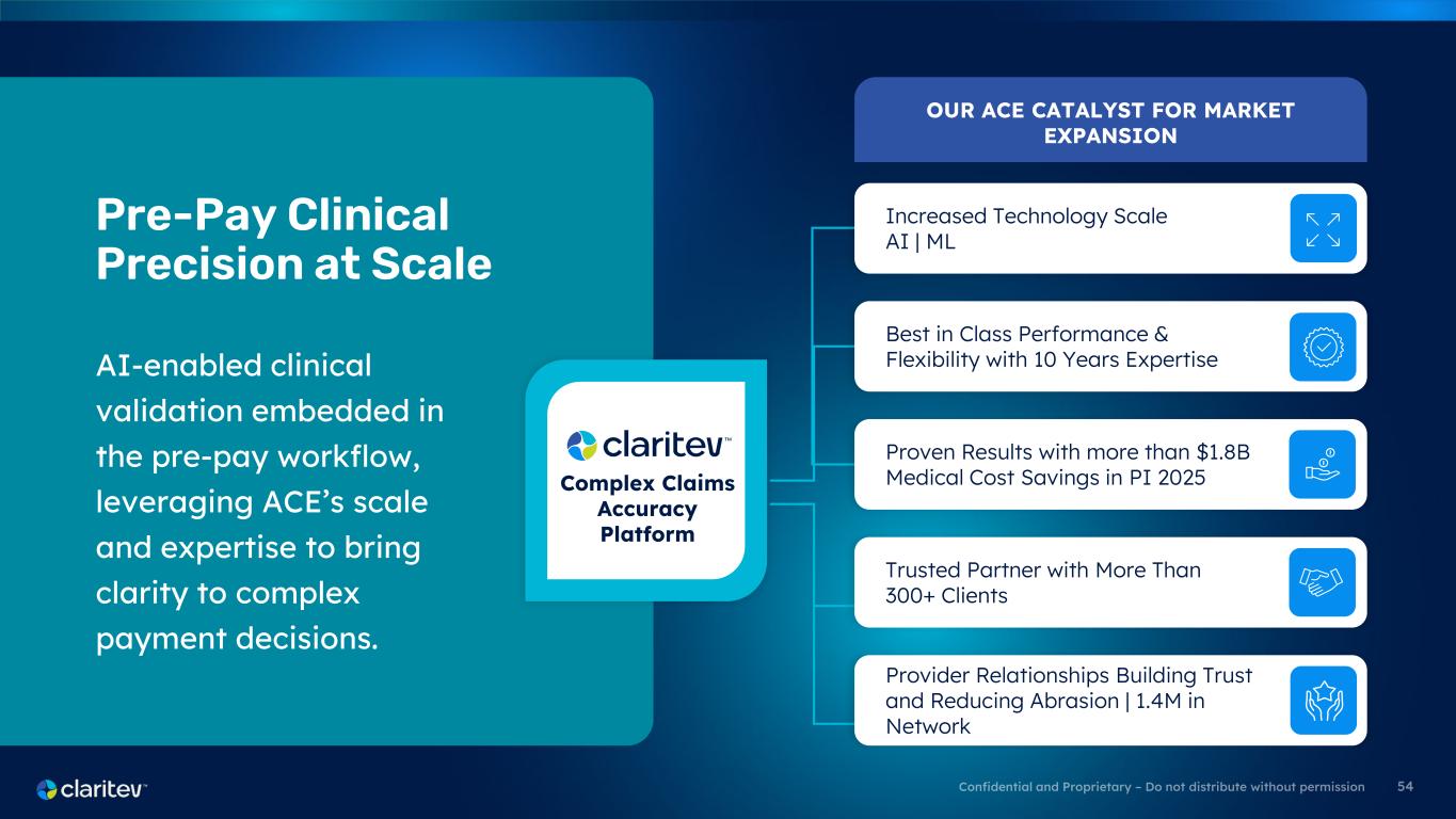 Confidential and Proprietary – Do not distribute without permission 53 Additional complex coding edits to launch in 2027+ A Complex Claims Accuracy Platform Built from Proven Technology Revolutionizing our Advanced Code Editing (ACE) solution into a comprehensive, complex claim accuracy platform — validating hospital claims are assigned the correct DRG to increase payment precision. 01 03 Claim is received Claritev requests medical records Pre-Payment DRG Review Process for Inpatient Claims 05 Claim with savings returned to payer; provider education occurs • The patient’s main diagnosis • Procedures performed • Complications or comorbidities • Age, discharge status, and other factors Payment Methodology Based On: 04 02 Claritev clinical team reviews claim and medical record Analytics identify & flag for validation