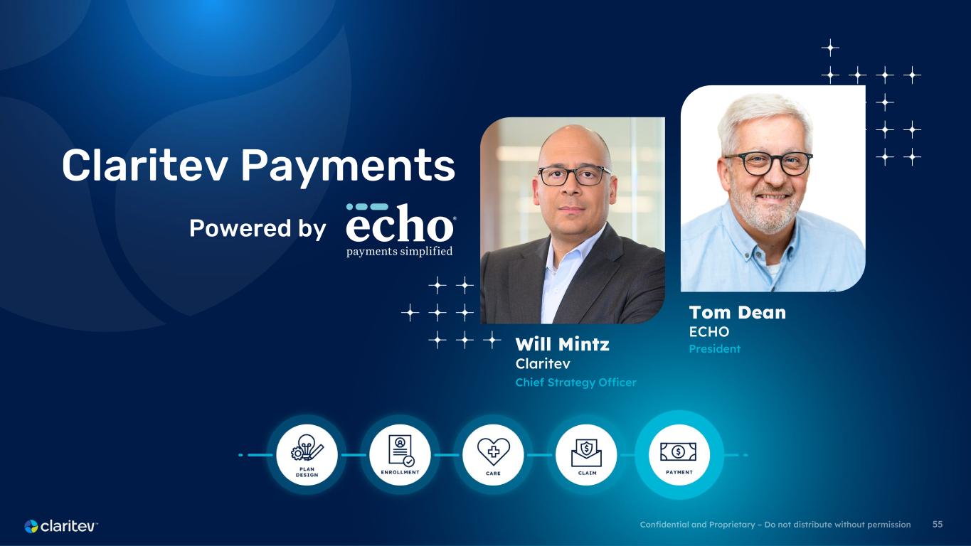 Confidential and Proprietary – Do not distribute without permission 55 Claritev Payments Will Mintz Claritev Tom Dean ECHO President Chief Strategy Officer Powered by