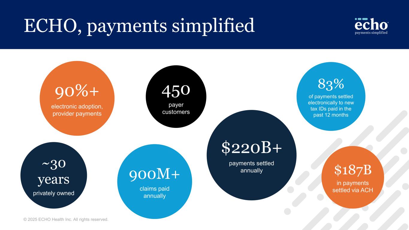 © 2025 ECHO Health Inc. All rights reserved. ECHO, payments simplified 450 payer customers $220B+ payments settled annually 90%+ electronic adoption, provider payments ~30 years privately owned 83% of payments settled electronically to new tax IDs paid in the past 12 months $187B in payments settled via ACH 900M+ claims paid annually