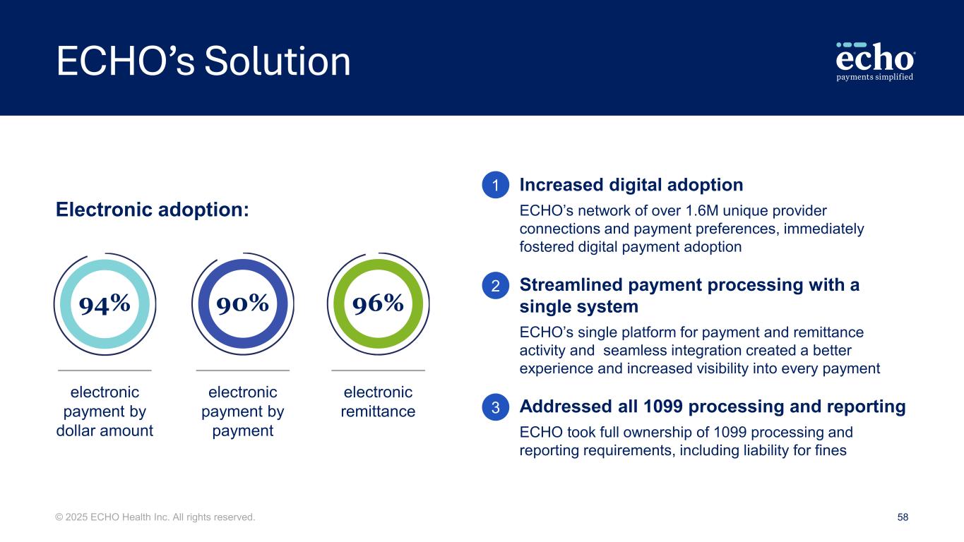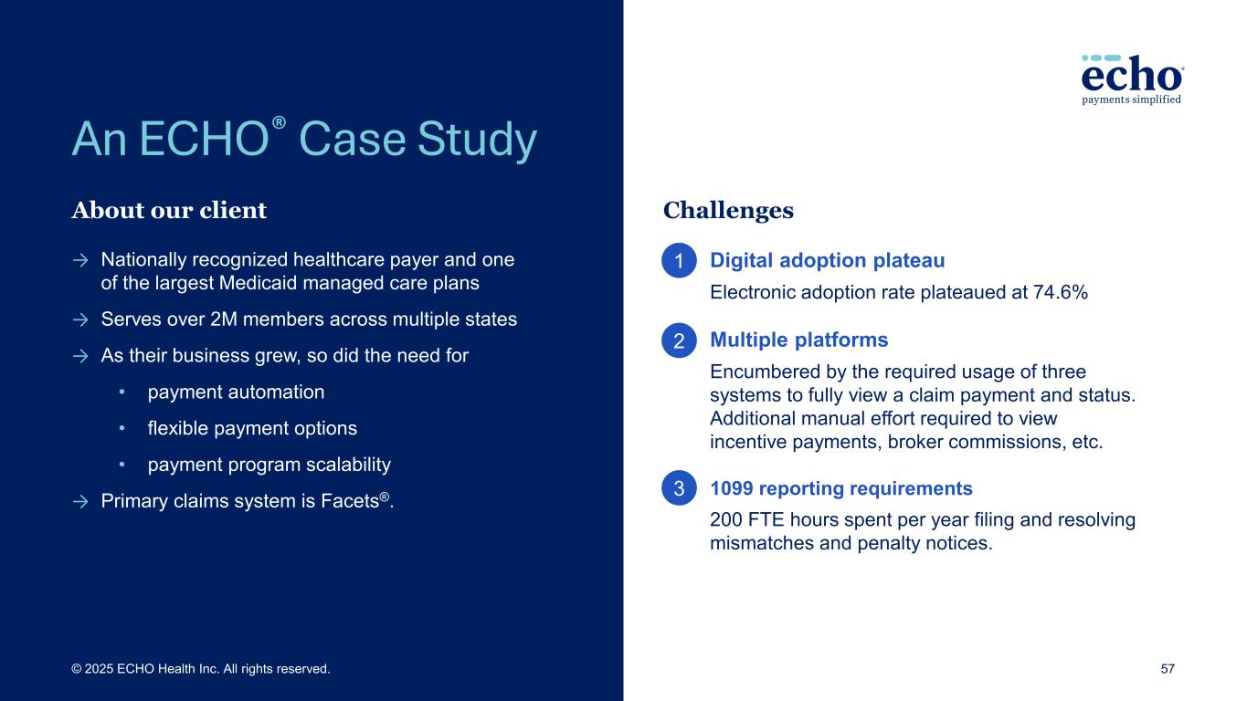 © 2025 ECHO Health Inc. All rights reserved. 57 An ECHO® Case Study About our client → Nationally recognized healthcare payer and one of the largest Medicaid managed care plans → Serves over 2M members across multiple states → As their business grew, so did the need for • payment automation • flexible payment options • payment program scalability → Primary claims system is Facets®. Challenges Digital adoption plateau Electronic adoption rate plateaued at 74.6% Multiple platforms Encumbered by the required usage of three systems to fully view a claim payment and status. Additional manual effort required to view incentive payments, broker commissions, etc. 1099 reporting requirements 200 FTE hours spent per year filing and resolving mismatches and penalty notices. 1 2 3
