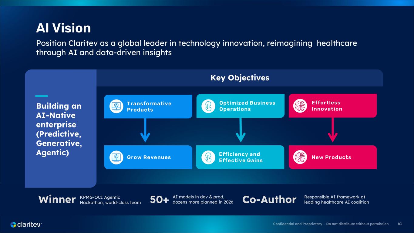 Confidential and Proprietary – Do not distribute without permission 61 Effortless Innovation Optimized Business Operations AI Vision Transformative Products Key Objectives Building an AI-Native enterprise (Predictive, Generative, Agentic) Position Claritev as a global leader in technology innovation, reimagining healthcare through AI and data-driven insights Winner 50+ AI models in dev & prod, dozens more planned in 2026 KPMG-OCI Agentic Hackathon, world-class team Co-Author Responsible AI framework at leading healthcare AI coalition Grow Revenues Efficiency and Effective Gains New Products