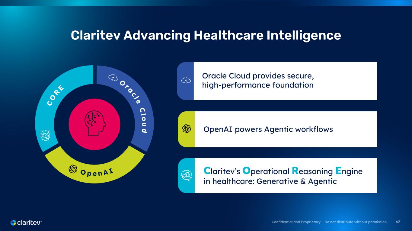 Confidential and Proprietary – Do not distribute without permission 62 Claritev Advancing Healthcare Intelligence Claritev’s Operational Reasoning Engine in healthcare: Generative & Agentic Oracle Cloud provides secure, high-performance foundation OpenAI powers Agentic workflows