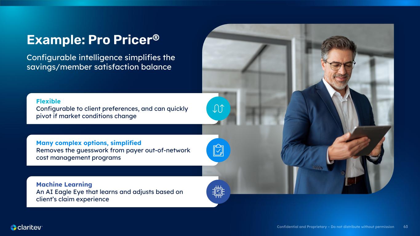 Confidential and Proprietary – Do not distribute without permission 63 Example: Pro Pricer® Many complex options, simplified Removes the guesswork from payer out-of-network cost management programs Configurable intelligence simplifies the savings/member satisfaction balance Flexible Configurable to client preferences, and can quickly pivot if market conditions change Machine Learning An AI Eagle Eye that learns and adjusts based on client’s claim experience
