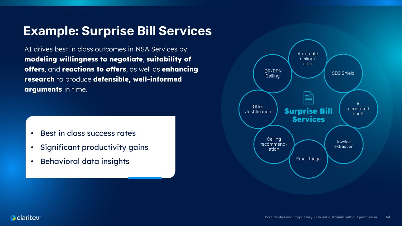 Confidential and Proprietary – Do not distribute without permission 64 Surprise Bill Services Automate ceiling/ offer SBS Shield AI generated briefs Invoice extraction Email triage Ceiling recommend- ation Offer Justification IDR/PPN Ceiling • Best in class success rates​ • Significant productivity gains​ • Behavioral data insights​ Example: Surprise Bill Services AI drives best in class outcomes in NSA Services by modeling willingness to negotiate, suitability of offers, and reactions to offers, as well as enhancing research to produce defensible, well-informed arguments in time.