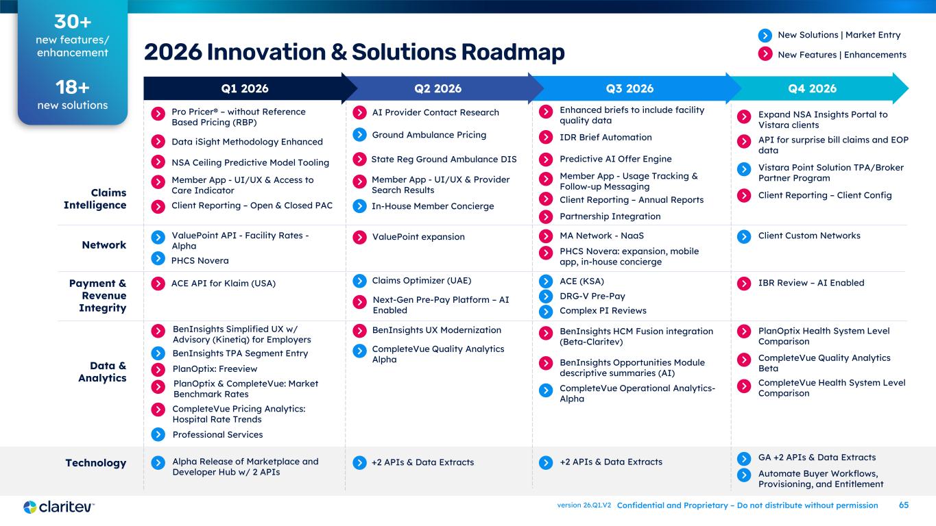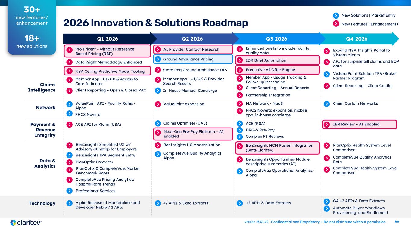 Confidential and Proprietary – Do not distribute without permission 65 Claims Intelligence Network Payment & Revenue Integrity Data & Analytics 2026 Innovation & Solutions Roadmap New Solutions | Market Entry New Features | Enhancements Claims Optimizer (UAE) Technology Alpha Release of Marketplace and Developer Hub w/ 2 APIs In-House Member Concierge Pro Pricer® – without Reference Based Pricing (RBP) NSA Ceiling Predictive Model Tooling Partnership Integration +2 APIs & Data Extracts +2 APIs & Data Extracts ValuePoint API - Facility Rates - Alpha PHCS Novera: expansion, mobile app, in-house conciergePHCS Novera Enhanced briefs to include facility quality data IDR Brief Automation ACE (KSA) MA Network - NaaS Ground Ambulance Pricing Data iSight Methodology Enhanced Member App - UI/UX & Access to Care Indicator GA +2 APIs & Data Extracts Client Reporting – Open & Closed PAC Client Custom NetworksValuePoint expansion Next-Gen Pre-Pay Platform – AI Enabled Vistara Point Solution TPA/Broker Partner Program IBR Review – AI Enabled Predictive AI Offer EngineState Reg Ground Ambulance DIS Expand NSA Insights Portal to Vistara clients ACE API for Klaim (USA) Member App - UI/UX & Provider Search Results Member App - Usage Tracking & Follow-up Messaging BenInsights UX Modernization CompleteVue Quality Analytics Alpha BenInsights Opportunities Module descriptive summaries (AI) BenInsights Simplified UX w/ Advisory (Kinetiq) for Employers PlanOptix: Freeview CompleteVue Pricing Analytics: Hospital Rate Trends PlanOptix Health System Level Comparison CompleteVue Quality Analytics Beta BenInsights TPA Segment Entry BenInsights HCM Fusion integration (Beta-Claritev) CompleteVue Operational Analytics- Alpha CompleteVue Health System Level Comparison Professional Services version 26.Q1.V2 AI Provider Contact Research API for surprise bill claims and EOP data Client Reporting – Client ConfigClient Reporting – Annual Reports PlanOptix & CompleteVue: Market Benchmark Rates DRG-V Pre-Pay Complex PI Reviews Automate Buyer Workflows, Provisioning, and Entitlement Q4 2026Q3 2026Q2 2026Q1 2026 30+ new features/ enhancement 18+ new solutions