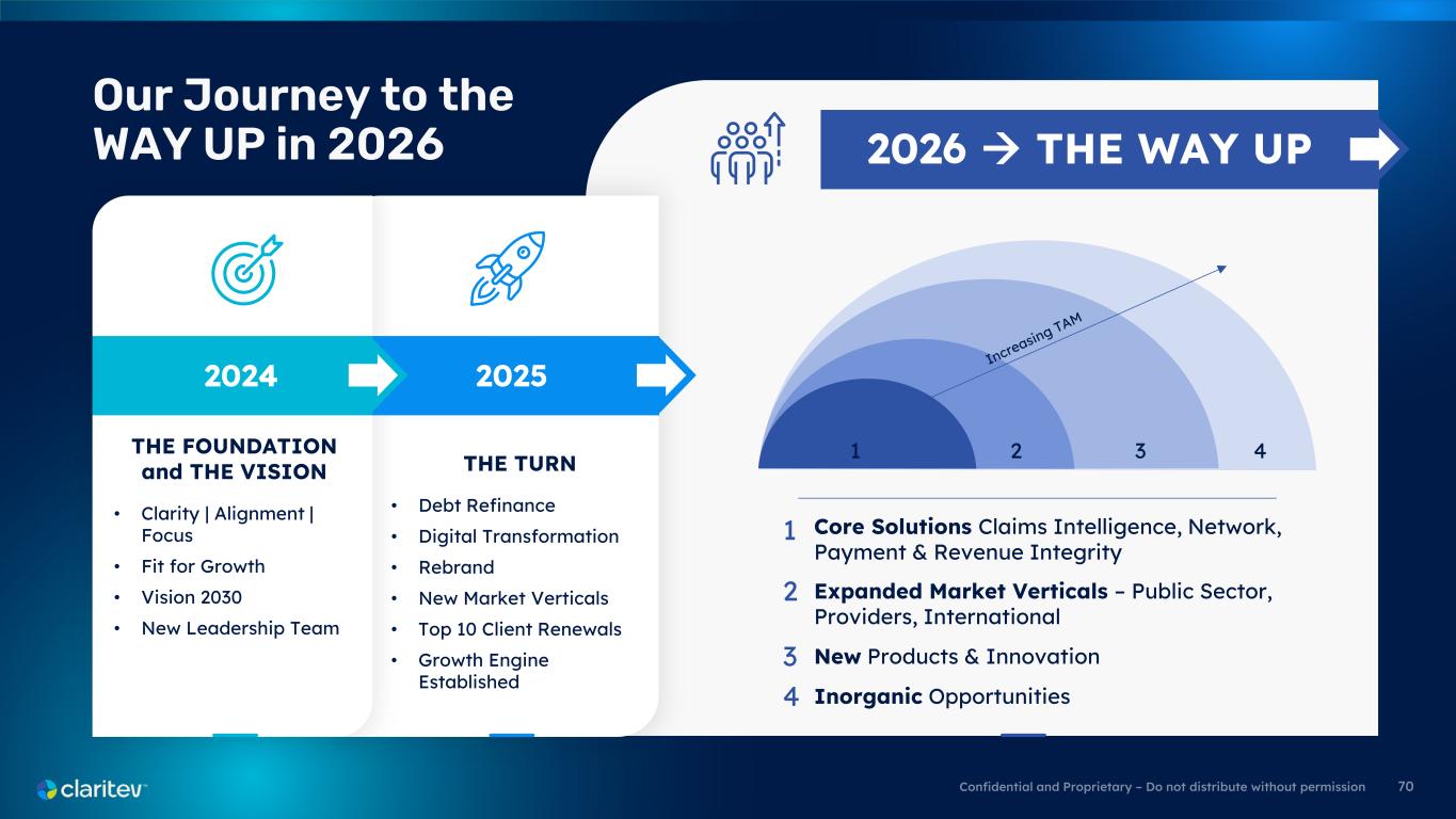 Confidential and Proprietary – Do not distribute without permission 70 Our Journey to the WAY UP in 2026 THE FOUNDATION and THE VISION • Clarity | Alignment | Focus • Fit for Growth • Vision 2030 • New Leadership Team THE TURN • Debt Refinance • Digital Transformation • Rebrand • New Market Verticals • Top 10 Client Renewals • Growth Engine Established 2024 2025 1 Core Solutions Claims Intelligence, Network, Payment & Revenue Integrity 2 Expanded Market Verticals – Public Sector, Providers, International 3 New Products & Innovation 4 Inorganic Opportunities 1 2 3 4 2026  THE WAY UP