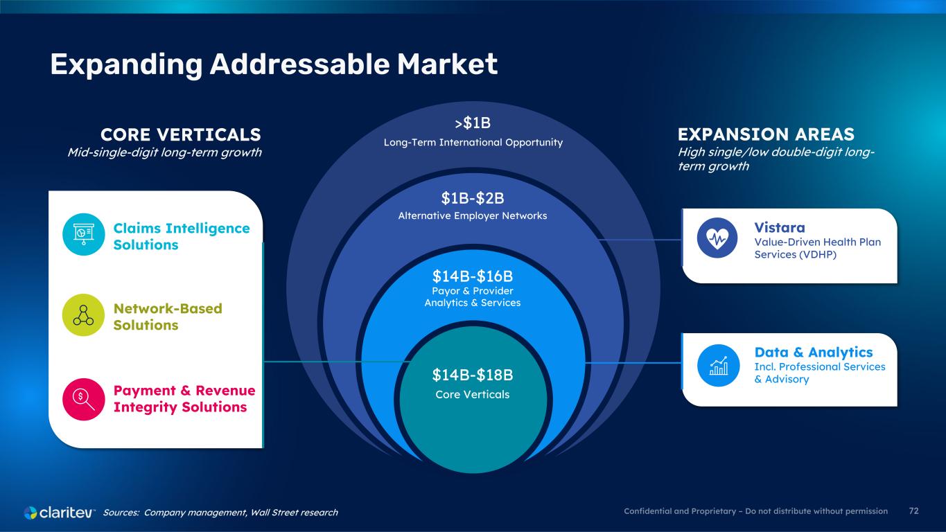 Confidential and Proprietary – Do not distribute without permission 72Sources: Company management, Wall Street research Expanding Addressable Market CORE VERTICALS Mid-single-digit long-term growth Claims Intelligence Solutions Payment & Revenue Integrity Solutions Network-Based Solutions EXPANSION AREAS High single/low double-digit long- term growth Vistara Value-Driven Health Plan Services (VDHP) Data & Analytics Incl. Professional Services & Advisory Long-Term International Opportunity Alternative Employer Networks >$1B $14B-$16B $14B-$18B Core Verticals $1B-$2B Payor & Provider Analytics & Services