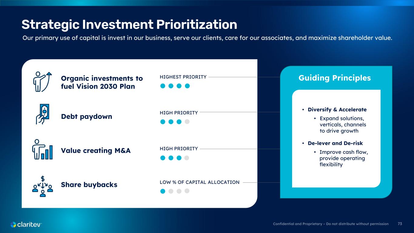 Confidential and Proprietary – Do not distribute without permission 73 Our primary use of capital is invest in our business, serve our clients, care for our associates, and maximize shareholder value. HIGHEST PRIORITYOrganic investments to fuel Vision 2030 Plan Debt paydown Value creating M&A Share buybacks HIGH PRIORITY HIGH PRIORITY LOW % OF CAPITAL ALLOCATION Strategic Investment Prioritization • Diversify & Accelerate • Expand solutions, verticals, channels to drive growth • De-lever and De-risk • Improve cash flow, provide operating flexibility Guiding Principles